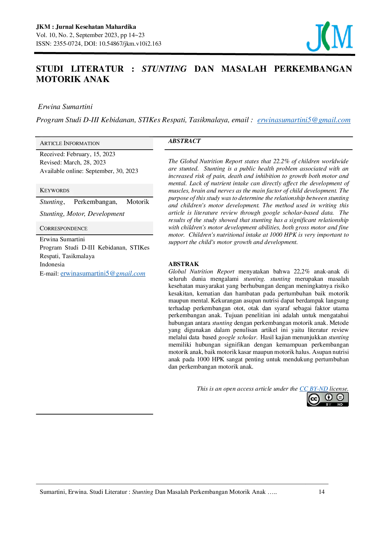 Jurnal Kesehatan MahardikaJurnal Kesehatan MahardikaGlobal Nutrition Report menyatakan bahwa 22,2% anak-anak di seluruh dunia mengalami stunting. Stunting merupakan masalah kesehatan masyarakat yang berhubungan dengan meningkatnya risiko kesakitan, kematian dan hambatan pada pertumbuhan baik motorik maupun mental. Kekurangan asupan nutrisi dapat berdampak langsung terhadap perkembangan otot, otak dan syaraf sebagai faktor utama perkembangan anak. Tujuan penelitian ini adalah untuk mengetahui hubungan antara stunting dengan perkembangan motorik anak. Metode yang digunakan dalam penulisan artikel ini yaitu literatur review melalui data base google scholar. Hasil kajian menunjukkan stunting memiliki hubungan signifikan dengan kemampuan perkembangan motorik anak, baik motorik kasar maupun motorik halus. Asupan nutrisi anak pada 1000 HPK sangat penting untuk mendukung pertumbuhan dan perkembangan motorik anak.