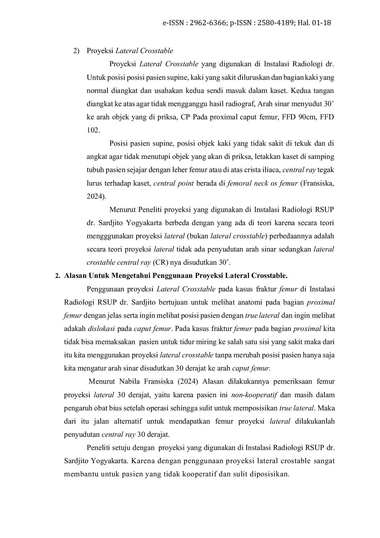 Jurnal Kesehatan AmanahJurnal Kesehatan AmanahPemeriksaan Os Femur pada kasus fraktur di Instalasi Radiologi RSUP dr.Sardjito Yogyakarta dilakukan pemeriksaan menggunakan proyeksi lateral dengan penyudutan arah central ray 30 derajat ke arah cranial. Sedangkan menurut beberapa teori menyebutkan bahwa penggunaan proyeksi lateral tidak ada penyudutan arah central ray . Tujuan penelitian ini adalah untuk mengetahui prosedur pemeriksaan Os Femur fraktur femur, serta alasan penggunaan proyeksi lateral Instalasi Radiologi RSUP dr.Sardjito Yogyakarta. Metode penelitian yang digunakan pada penelitian ini adalah penelitian kualitatif dengan metode deskriptif dan pendekatan studi kasus. Penelitian dilakukan di Instalasi Radiologi RSUP dr.Sardjito Yogyakarta pada bulan Februari-Maret 2025 dengan subjek penelitian 3 radiografer, dan 1 dokter spesialis radiologi. Metode pengambilan data yang dilakukan adalah observasi, wawancara, dokumentasi, serta studi kepustakaan. Analisis data dilakukan dengan pengumpulan data, reduksi data, penyajian data kemudian ditarik kesimpulan. Hasil penelitian yang didapatkan adalah terdapat perbedaan pada proyeksi dan posisi pasien pada kasus fraktur femur untuk proyeski yang digunakan yaitu proyeksi lateral crosstable dengan penyudutan arah central ray 30 derajat ke arah cranial dan untuk posisi pasien supine di atas meja pemeriksaan. Tujuan penggunaan proyeksi lateral crosstable yaitu untuk melihat fraktur femur pada bagian proximal dan sangat membantu untuk pasien yang tidak kooperatif.