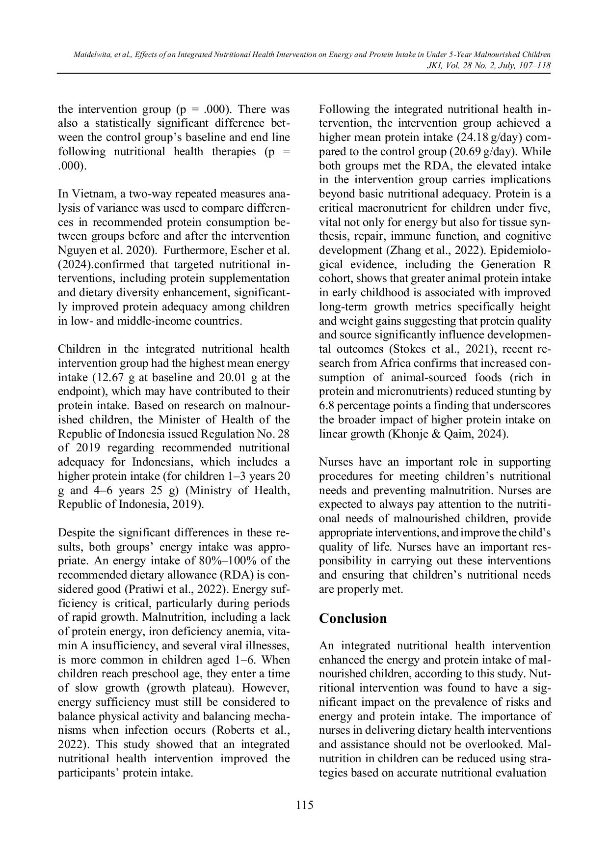 Penelitian ini menunjukkan bahwa intervensi kesehatan gizi terpadu meningkatkan asupan energi dan protein pada anak-anak yang mengalami malnutrisi, serta memberikan dampak yang signifikan dalam mengurangi prevalensi faktor risiko ketika asupan energi dan protein yang memadai tersedia.Intervensi ini penting untuk meningkatkan kualitas gizi anak balita dan mencegah masalah kesehatan terkait malnutrisi.Penelitian lebih lanjut diperlukan untuk mengeksplorasi strategi implementasi yang lebih efektif dan berkelanjutan.