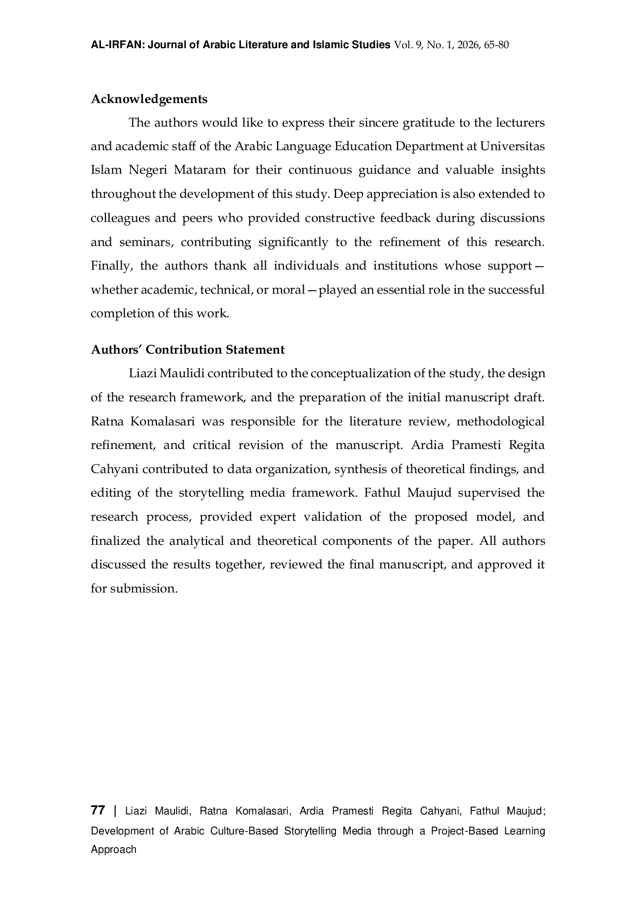 Al-Irfan : Journal of Arabic Literature and Islamic StudiesAl-Irfan : Journal of Arabic Literature and Islamic StudiesPenelitian ini bertujuan untuk menganalisis dan merumuskan kerangka konseptual model pembelajaran Project-Based Learning (PjBL) yang berfokus pada pembuatan storytelling (bercerita) berbasis konten budaya Arab guna meningkatkan kompetensi berbahasa Arab siswa. Latar belakang penelitian didasarkan pada perlunya pengembangan model pembelajaran yang inovatif untuk meningkatkan keterampilan berbicara (mahārat al‑kalām) dan mengintegrasikan materi budaya otentik dalam pembelajaran Bahasa Arab. Metode yang digunakan adalah Kualitatif Deskriptif dengan pendekatan Studi Pustaka (Library Research). Data dikumpulkan melalui penelaahan sistematis terhadap berbagai literatur, termasuk buku, jurnal ilmiah, dan dokumen terkait mengenai teori Project-Based Learning, prinsip pengembangan media storytelling, serta integrasi konten budaya Arab. Penelitian ini menghasilkan sebuah model kerangka kerja (framework) Project‑Based Learning (PjBL) untuk pembuatan storytelling bernuansa budaya Arab yang siap diimplementasikan di kelas. Model ini dirancang untuk mendorong siswa berkolaborasi secara aktif dan menggunakan bahasa Arab dalam konteks autentik, yaitu mencipta dan menyajikan cerita, sehingga diperkirakan mampu meningkatkan keterampilan berbicara (mahārat al‑kalām). Selain itu, model ini diharapkan dapat meningkatkan minat belajar serta pemahaman siswa terhadap budaya Arab. Secara konseptual, model ini layak diterapkan dan berpotensi menjadi pendekatan baru yang efektif dalam membuat pembelajaran bahasa Arab lebih menarik dan praktis.