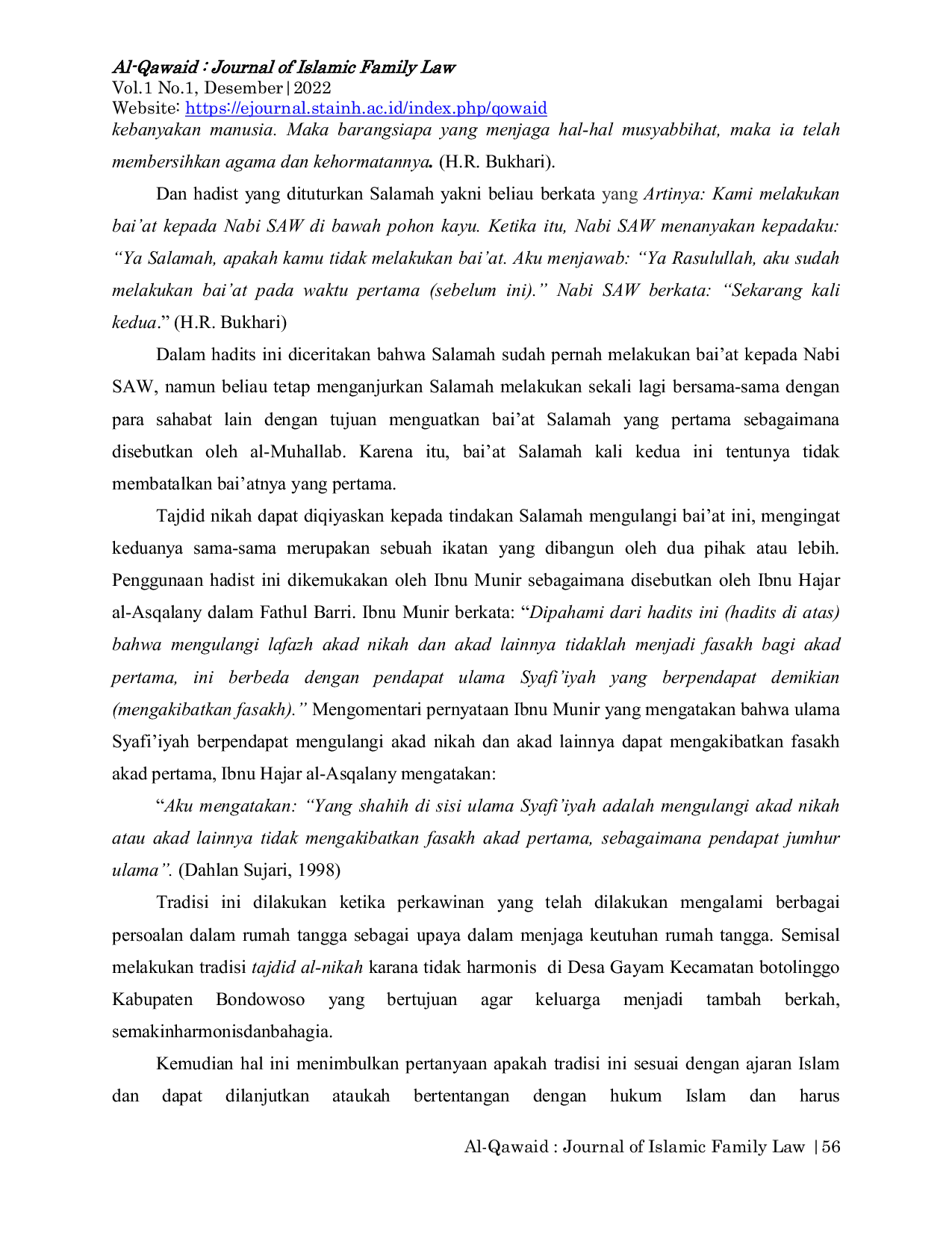 Al-Qawaid : Journal of Islamic Family LawAl-Qawaid : Journal of Islamic Family LawPernikahan merupakan hal lazim yang dilakukan oleh semua manusia, baik didasari cinta maupun tujuan tertentu seperti ingin memiliki keturunan. Dalam sebuah pernikahan terjadinya pertikaian dalam rumah tangga merupakan hal yang lumrah dan dapat menyebabkan hubungan menjadi erat atau melonggar; pertikaian berlebihan dapat menimbulkan masalah lebih besar, sehingga tradisi tajdid al-nikah hadir sebagai solusi untuk mengharmonisasi kembali hubungan keluarga. Penelitian ini berfokus pada praktek tradisi tajdid al-nikah di Desa Gayam Kecamatan Botolinggo Kabupaten Bondowoso serta pandangan hukum Islam terhadap tradisi tersebut, menggunakan metode penelitian hukum empiris dengan data akurat dari lapangan yang disusun dalam skema mudah dipahami. Pelaksanaan tajdid al-nikah dilaksanakan seperti pernikahan pada umumnya, memenuhi rukun dan syarat nikah, dengan perbedaan pada tidak adanya tamu serta pernak-pernik; hukumnya dianggap boleh karena tidak merusak akad nikah sebelumnya dan tidak bertentangan dengan syara.