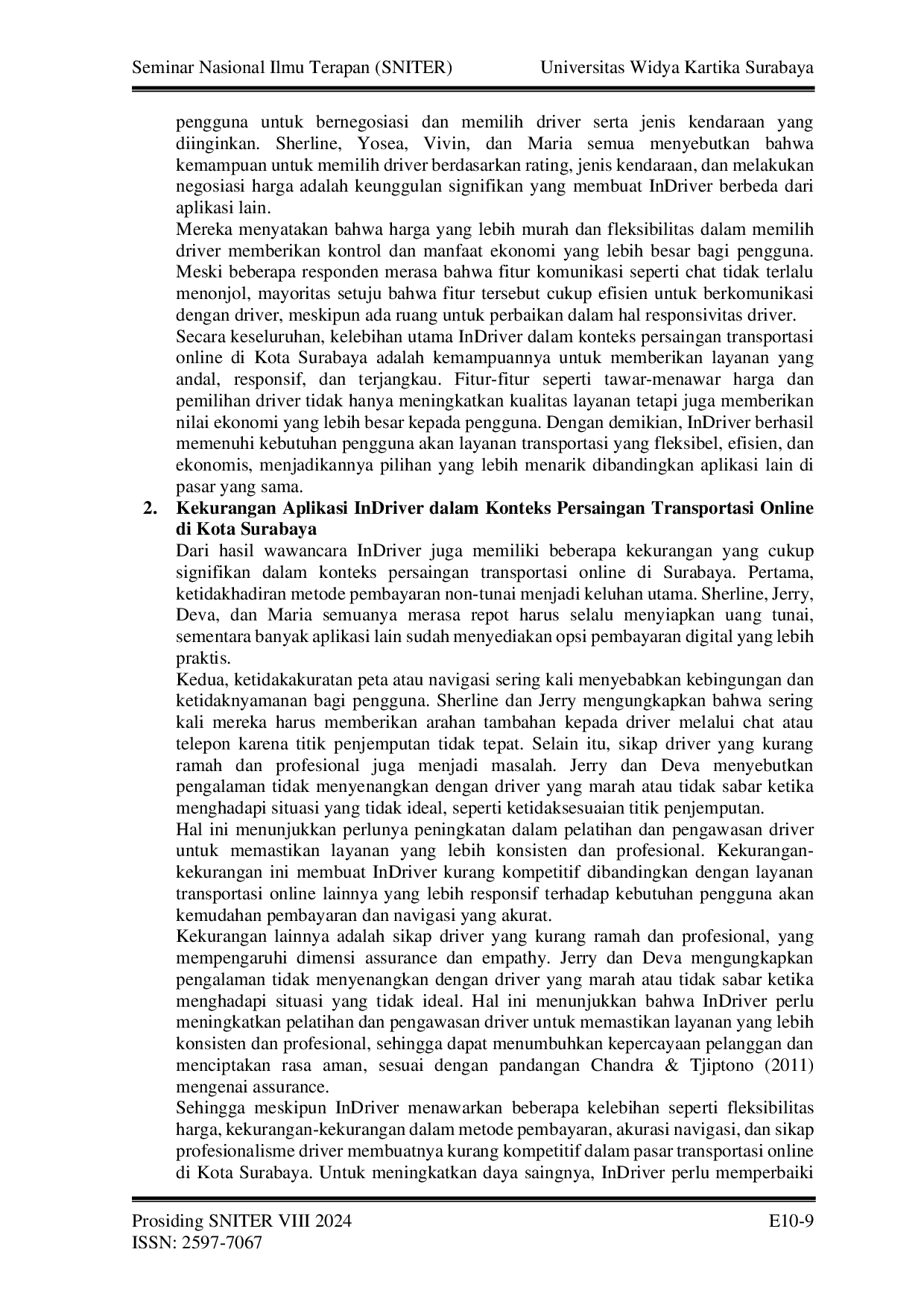 Seminar Nasional Ilmu TerapanSeminar Nasional Ilmu TerapanPenelitian ini bertujuan untuk mengetahui persepsi pengguna aplikasi InDriver dan kelebihan beserta kekurangannya terhadap persaingan transportasi online di Kota Surabaya. Penelitian ini merupakan penelitian lapangan dengan pendekatan deskriptif kualitatif. Data primer yang digunakan adalah wawancara kepada tujuh orang pengguna InDriver di Surabaya, penentuan informan ditentukan dengan simple random sampling. Data yang diambil diperoleh melalui observasi, wawancara, dan dokumentasi. Pengolahan data dilakukan dengan editing, klasifikasi, dan interpretasi, yang kemudian dianalisis secara deskriptif. Hasil penelitian menunjukkan bahwa persepsi pengguna aplikasi InDriver di Kota Surabaya cenderung positif karena fitur tawar-menawar harga, pilihan driver, dan jenis kendaraan yang memberikan fleksibilitas lebih dibandingkan layanan transportasi online lainnya. Pengguna mengapresiasi harga yang lebih ekonomis dan nilai tambah dari fitur tawar-menawar. Namun ada kekurangan seperti tidak adanya metode pembayaran non-tunai dan masalah pembatalan order oleh driver menyebabkan ketidaknyamanan yang dirasakan pengguna. Kelebihan utama InDriver adalah fitur tawar-menawar harga yang memungkinkan pengguna untuk bernegosiasi dan memilih driver serta jenis kendaraan, memberikan fleksibilitas, kontrol, dan manfaat ekonomi yang lebih besar. Kemampuan memilih driver berdasarkan rating dan jenis kendaraan juga meningkatkan rasa percaya pengguna. Namun, ada kekurangan seperti tidak adanya metode pembayaran non-tunai, ketidakakuratan peta atau navigasi, dan sikap driver yang kurang ramah dan profesional.