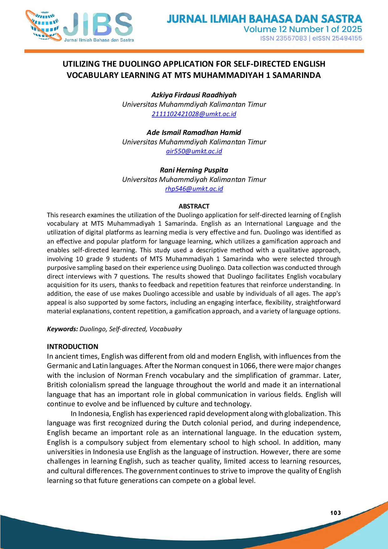 (JIBS) JURNAL ILMIAH BAHASA DAN SASTRA(JIBS) JURNAL ILMIAH BAHASA DAN SASTRAPenelitian ini mengkaji pemanfaatan aplikasi Duolingo untuk pembelajaran mandiri kosakata bahasa Inggris di MTS Muhammadiyah 1 Samarinda. Bahasa Inggris sebagai bahasa internasional dan pemanfaatan platform digital sebagai media pembelajaran dinilai sangat efektif dan menyenangkan. Duolingo diidentifikasi sebagai platform pembelajaran bahasa yang efektif dan populer, yang menggunakan pendekatan gamifikasi serta memungkinkan pembelajaran mandiri. Studi ini menggunakan metode deskriptif dengan pendekatan kualitatif, melibatkan 10 siswa kelas 9 MTS Muhammadiyah 1 Samarinda yang dipilih melalui purposive sampling berdasarkan pengalaman mereka menggunakan Duolingo. Pengumpulan data dilakukan melalui wawancara langsung dengan 7 pertanyaan. Hasil penelitian menunjukkan bahwa Duolingo memfasilitasi pemerolehan kosakata bahasa Inggris bagi penggunanya, berkat fitur umpan balik dan pengulangan yang memperkuat pemahaman. Selain itu, kemudahan penggunaan menjadikan Duolingo dapat diakses dan digunakan oleh individu dari segala usia. Daya tarik aplikasi ini juga didukung oleh beberapa faktor, termasuk antarmuka yang menarik, fleksibilitas, penjelasan materi yang lugas, pengulangan konten, pendekatan gamifikasi, dan beragam pilihan bahasa.