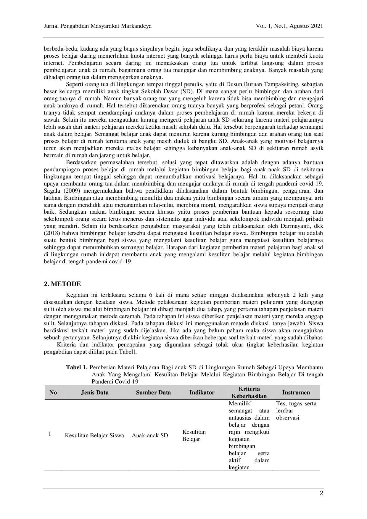 jurnal pengabdian masyarakat markandeyajurnal pengabdian masyarakat markandeyaPada masa pandemi covid-19, semua kegiatan belajar dan mengajar dilakukan secara daring. Banyak kendala yang dihadapi dalam pembelajaran secara daring, terutama bagi orang tua siswa sekolah dasar (SD) yang kurang optimal dalam mengajar dan membimbing anak-anaknya di rumah. Hal ini dapat menyebabkan anak menjadi malas belajar di rumah. Oleh karena itu, diperlukan kegiatan pemberian materi pelajaran bagi anak SD di lingkungan rumah sebagai upaya membantu anak yang mengalami kesulitan belajar melalui kegiatan bimbingan belajar di tengah pandemi covid-19. Kegiatan ini dilaksanakan di Dusun Buruan Tampaksiring dengan metode ceramah dan diskusi. Keberhasilan kegiatan ini dapat dilihat dari semangat dan antusiasme anak dalam mengikuti kegiatan, serta kemampuan mereka dalam menjawab pertanyaan dan tugas yang dianggap sulit.