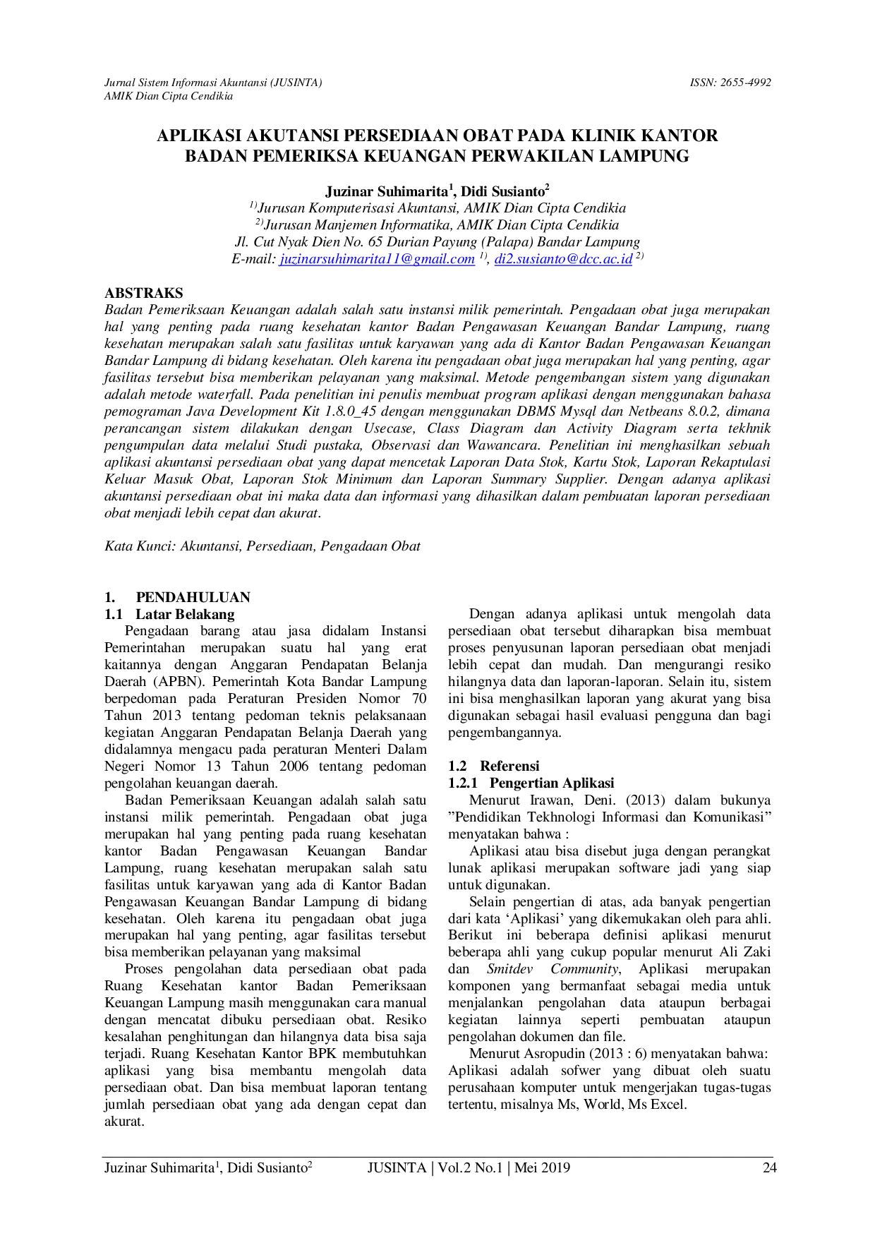 Jurnal JUSINTAJurnal JUSINTABadan Pemeriksaan Keuangan adalah salah satu instansi milik pemerintah. Pengadaan obat juga merupakan hal yang penting pada ruang kesehatan kantor Badan Pengawasan Keuangan Bandar Lampung, ruang kesehatan merupakan salah satu fasilitas untuk karyawan yang ada di Kantor Badan Pengawasan Keuangan Bandar Lampung di bidang kesehatan. Oleh karena itu pengadaan obat juga merupakan hal yang penting, agar fasilitas tersebut bisa memberikan pelayanan yang maksimal. Metode pengembangan sistem yang digunakan adalah metode waterfall. Pada penelitian ini penulis membuat program aplikasi dengan menggunakan bahasa pemograman Java Development Kit 1.8.0_45 dengan menggunakan DBMS Mysql dan Netbeans 8.0.2, dimana perancangan sistem dilakukan dengan Usecase, Class Diagram dan Activity Diagram serta tekhnik pengumpulan data melalui Studi pustaka, Observasi dan Wawancara. Penelitian ini menghasilkan sebuah aplikasi akuntansi persediaan obat yang dapat mencetak Laporan Data Stok, Kartu Stok, Laporan Rekaptulasi Keluar Masuk Obat, Laporan Stok Minimum dan Laporan Summary Supplier. Dengan adanya aplikasi akuntansi persediaan obat ini maka data dan informasi yang dihasilkan dalam pembuatan laporan persediaan obat menjadi lebih cepat dan akurat.