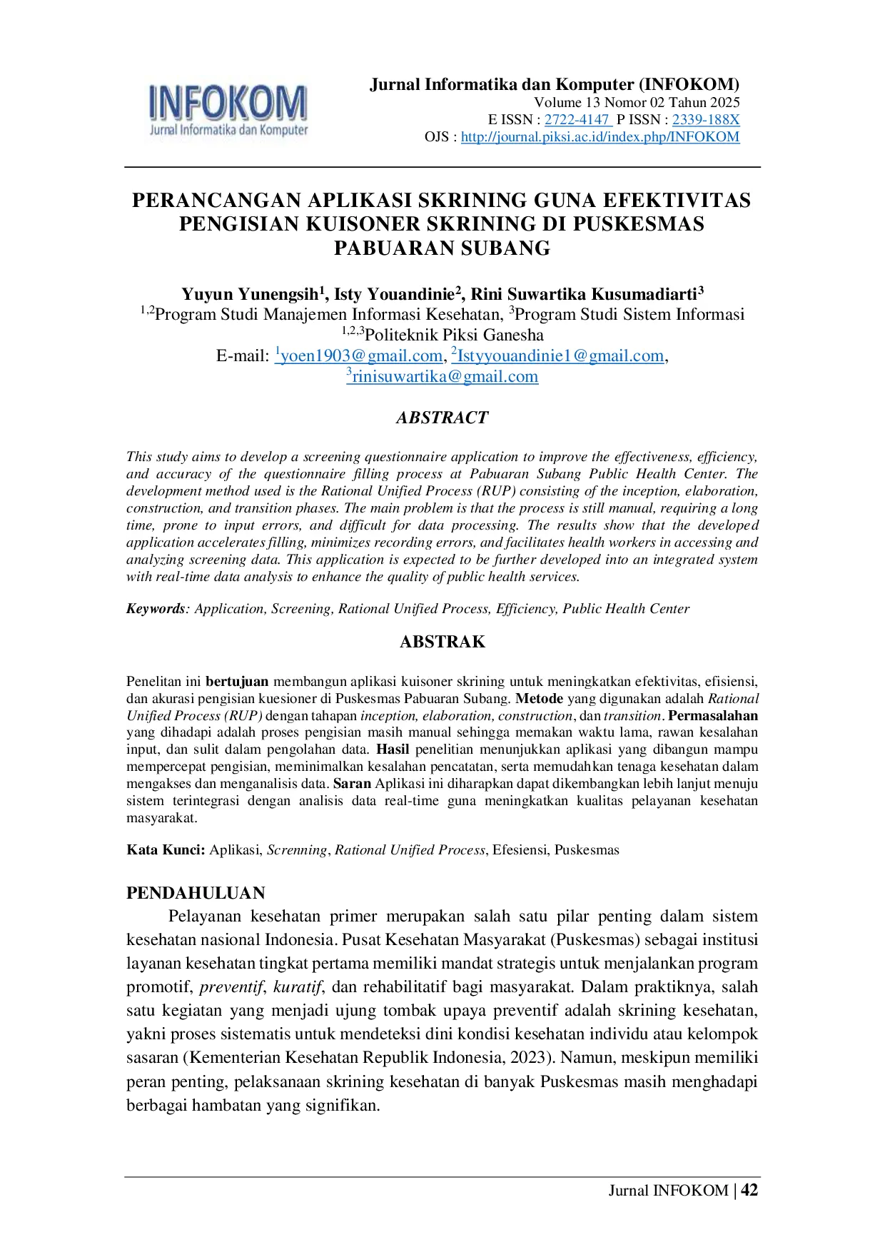 INFOKOM (Informatika & Komputer)INFOKOM (Informatika & Komputer)Penelitan ini bertujuan membangun aplikasi kuisoner skrining untuk meningkatkan efektivitas, efisiensi, dan akurasi pengisian kuesioner di Puskesmas Pabuaran Subang. Metode yang digunakan adalah Rational Unified Process (RUP) dengan tahapan inception, elaboration, construction, dan transition.