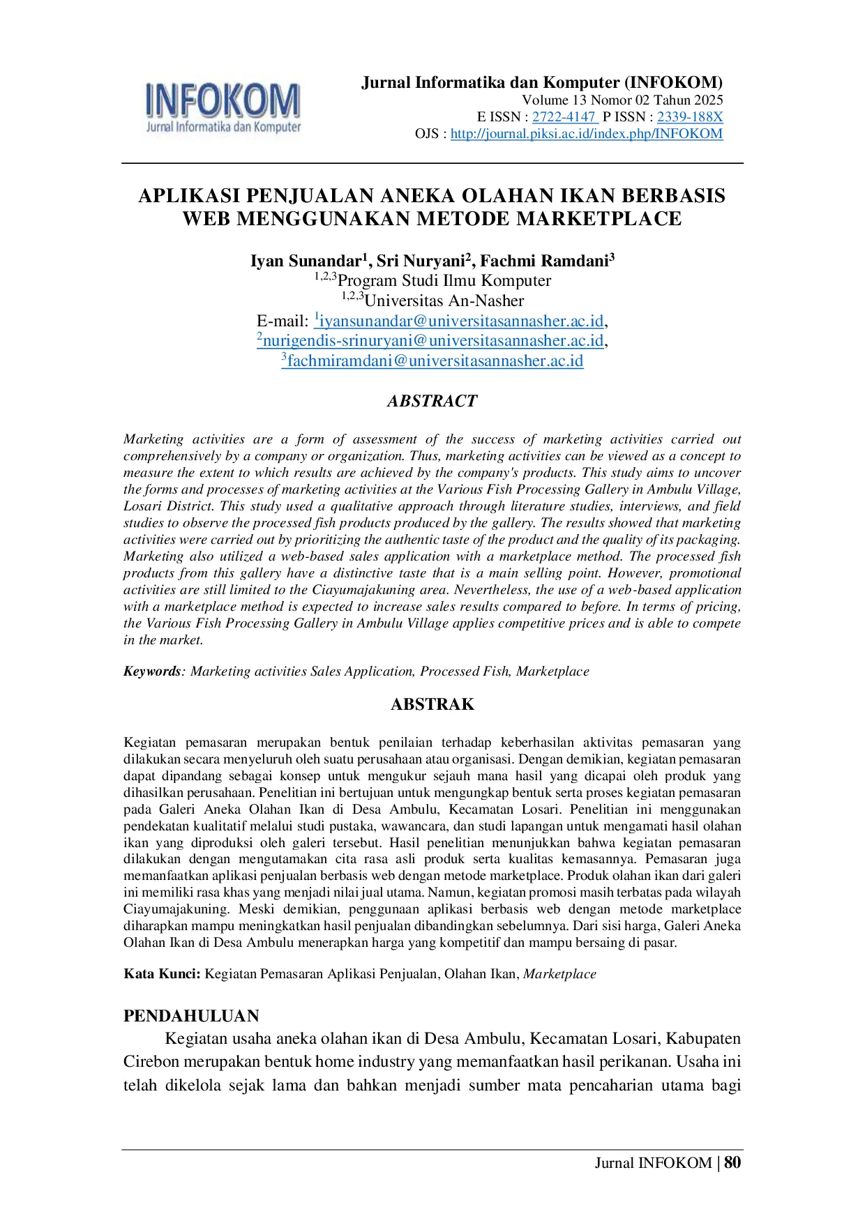 INFOKOM (Informatika & Komputer)INFOKOM (Informatika & Komputer)Kegiatan pemasaran merupakan bentuk penilaian terhadap keberhasilan aktivitas pemasaran yang dilakukan secara menyeluruh oleh suatu perusahaan atau organisasi. Penelitian ini bertujuan untuk mengungkap bentuk serta proses kegiatan pemasaran pada Galeri Aneka Olahan Ikan di Desa Ambulu, Kecamatan Losari. Penelitian ini menggunakan pendekatan kualitatif melalui studi pustaka, wawancara, dan studi lapangan untuk mengamati hasil olahan ikan yang diproduksi oleh galeri tersebut. Hasil penelitian menunjukkan bahwa kegiatan pemasaran dilakukan dengan mengutamakan cita rasa asli produk serta kualitas kemasannya. Pemasaran juga memanfaatkan aplikasi penjualan berbasis web dengan metode marketplace. Produk olahan ikan dari galeri ini memiliki rasa khas yang menjadi nilai jual utama. Namun, kegiatan promosi masih terbatas pada wilayah Ciayumajakuning. Meski demikian, penggunaan aplikasi berbasis web dengan metode marketplace diharapkan mampu meningkatkan hasil penjualan dibandingkan sebelumnya.