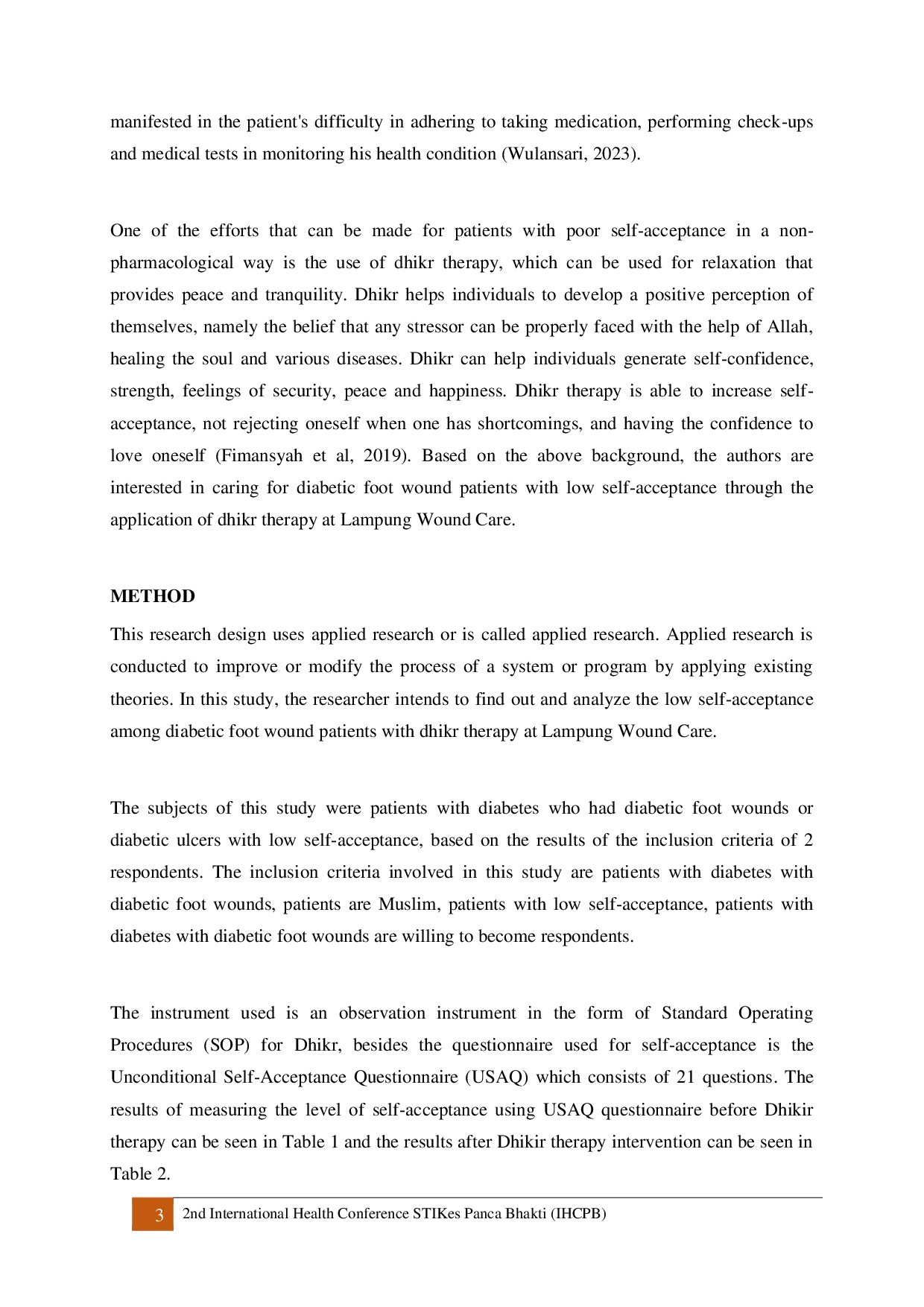 International Health Conference STIKes Panca Bhakti (IHCPB)International Health Conference STIKes Panca Bhakti (IHCPB)Penerimaan diri adalah kemampuan individu untuk menerima kekurangan dan kesalahan, rasa malu yang menghancurkan dan kecemasan yang ekstrem. Penelitian ini bertujuan untuk menentukan dan menganalisis perawatan keperawatan pada pasien luka kaki diabetes dengan rendah penerimaan diri sebelum dan setelah menggunakan terapi dhikr.
