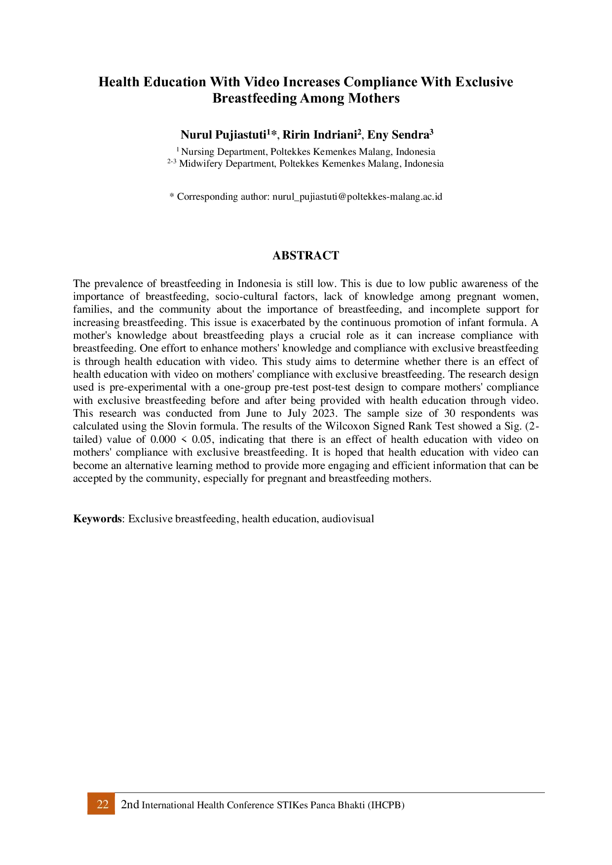 International Health Conference STIKes Panca Bhakti (IHCPB)International Health Conference STIKes Panca Bhakti (IHCPB)Prevalensi pemberian ASI di Indonesia masih rendah. Hal ini disebabkan oleh rendahnya kesadaran masyarakat tentang pentingnya pemberian ASI, faktor sosial-budaya, kurangnya pengetahuan ibu hamil, keluarga, dan masyarakat tentang manfaat pemberian ASI, serta dukungan yang tidak memadai untuk meningkatkan pemberian ASI. Masalah ini diperparah dengan promosi terus-menerus mengenai susu formula. Pengetahuan ibu tentang pemberian ASI memiliki peran penting karena dapat meningkatkan keterpatuhan dalam pemberian ASI. Salah satu upaya untuk meningkatkan pengetahuan dan keterpatuhan ibu dalam pemberian ASI eksklusif adalah melalui pendidikan kesehatan dengan video. Studi ini bertujuan untuk mengetahui apakah terdapat pengaruh pendidikan kesehatan dengan video terhadap keterpatuhan ibu dalam pemberian ASI eksklusif. Desain penelitian yang digunakan adalah pre-eksperimental dengan desain pre-test post-test pada satu kelompok untuk membandingkan keterpatuhan ibu dalam pemberian ASI eksklusif sebelum dan sesudah diberikan pendidikan kesehatan melalui video. Hasil uji Wilcoxon Signed Rank Test menunjukkan nilai Sig. (2-tailed) 0,000 < 0,05, menunjukkan bahwa terdapat pengaruh pendidikan kesehatan dengan video terhadap keterpatuhan ibu dalam pemberian ASI eksklusif. Diharapkan pendidikan kesehatan dengan video dapat menjadi metode belajar alternatif untuk menyampaikan informasi yang lebih menarik dan efisien yang dapat diterima masyarakat, khususnya bagi ibu hamil dan menyusui.