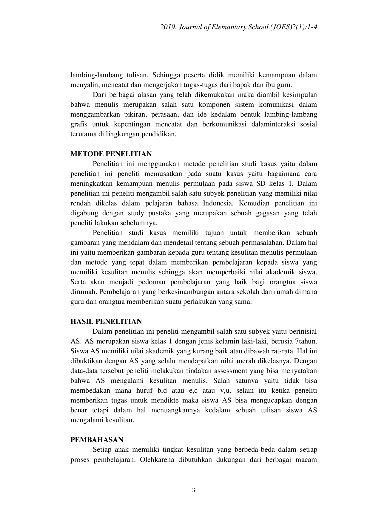 Journal of Elementary School (JOES)Journal of Elementary School (JOES)Penelitian ini bertujuan untuk mengetahui peningkatan kemampuan menulis permulaan dengan menggunakan metode analisis glass. Penelitian ini merupakan studi kasus terhadap anak kelas 1 sekolah dasar yang mengalami kesulitan menulis permulaan. Setelah dilakukan identifikasi faktor utama anak mengalami kesulitan menulis (disgrafia) yaitu faktor dalam diri anak sendiri dan lingkungan terutama orang tua dan kebiasaan sehari-hari dirumah. Penggunaan metode yang kreatif seperti metode analisis glass yaitu pemisahan suku kata persuku kata akan mempermudah siswa dalam menulis karena mengingat satu persatu suku kata yang akan dirangkai menjadi sebuah kata dan kalimat. Simpulan, pemberian pembelajaran dengan menggunakan metode analisis glass dapat memberikan peningkatan dalam kemampuan menulis permulaan siswa.