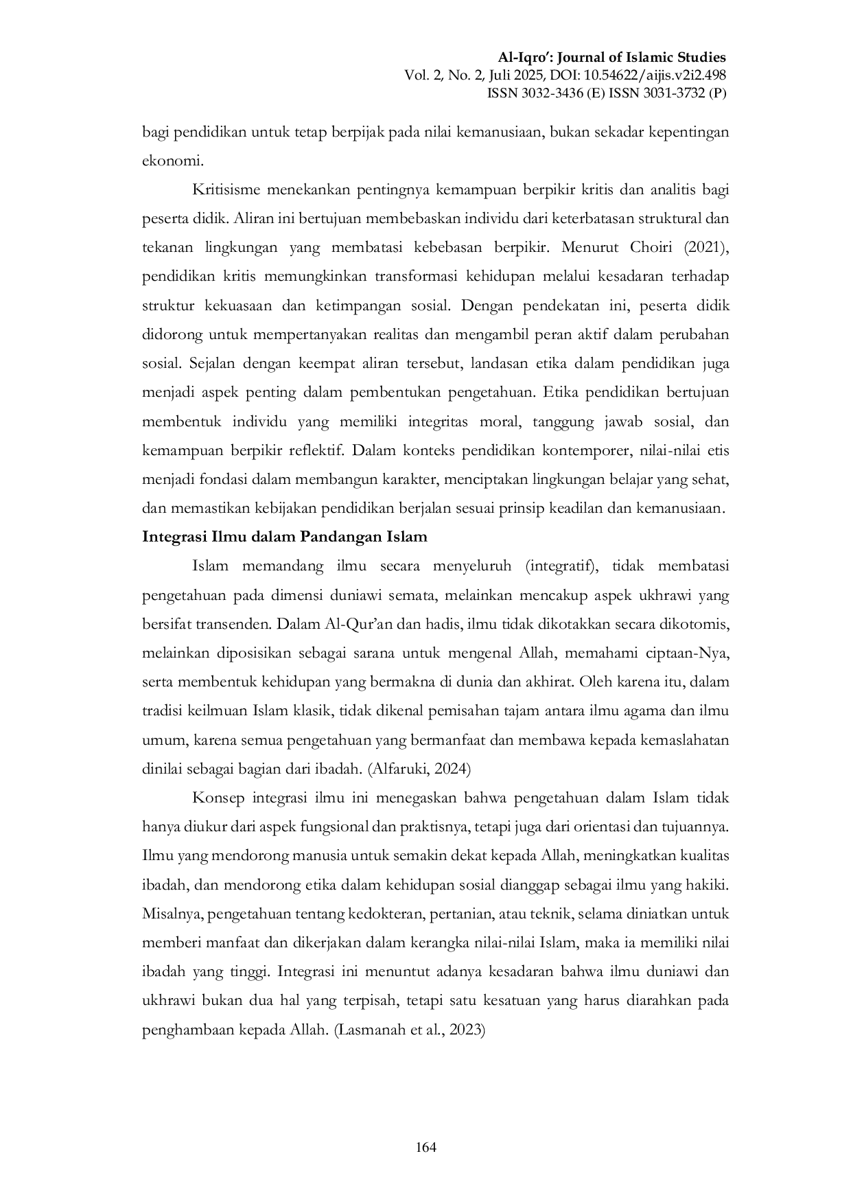 Integrasi keilmuan antara perspektif filsafat dan Islam bukan sekadar pilihan metodologis, melainkan kebutuhan mendasar dalam merumuskan sistem pendidikan dan peradaban yang utuh.Klasifikasi pengetahuan yang disandarkan pada keseimbangan antara akal, wahyu, dan pengalaman empirik memberikan arah baru bagi pendidikan yang tidak hanya mencerdaskan intelektualitas, tetapi juga menumbuhkan dimensi moral, spiritual, dan sosial.Dalam konteks ini, pendidikan ideal adalah yang mampu membentuk manusia sebagai subjek yang berpikir kritis, bertindak etis, dan menyadari tanggung jawab transendennya.Pendekatan integratif ini sekaligus menjadi jembatan untuk mengatasi dikotomi lama antara ilmu duniawi dan ukhrawi, serta menawarkan kerangka epistemologis yang menyatukan antara rasionalitas modern dan nilai-nilai keimanan.Maka, pengembangan ilmu pengetahuan ke depan harus diarahkan untuk menjadi jalan menuju kebijaksanaan dan kebermaknaan hidup, bukan sekadar akumulasi informasi atau kekuasaan teknologis.