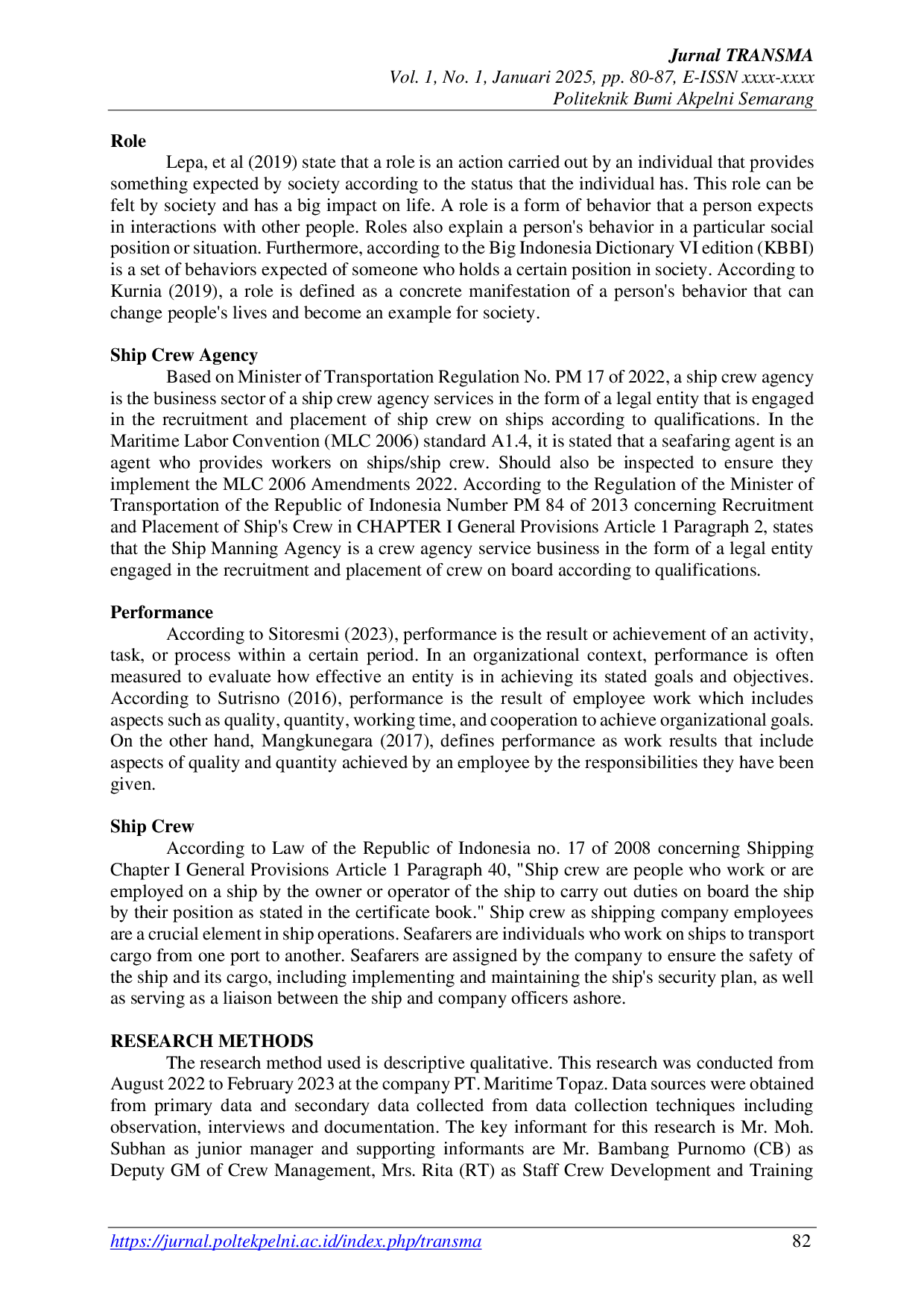 JURNAL TRANSPORTASI DAN MANAJEMEN MARITIM (TRANSMA)JURNAL TRANSPORTASI DAN MANAJEMEN MARITIM (TRANSMA)Keagenan awak kapal memiliki peran penting dalam peningkatan kinerja awak kapal melalui pengawasan tanggung jawab awak kapal. Jika terjadi penurunan kinerja oleh kru saat bekerja, maka hal tersebut berdampak negatif bagi perusahaan, sehingga permasalahan kinerja kru harus ditangani dengan baik oleh pihak keagenan kru.