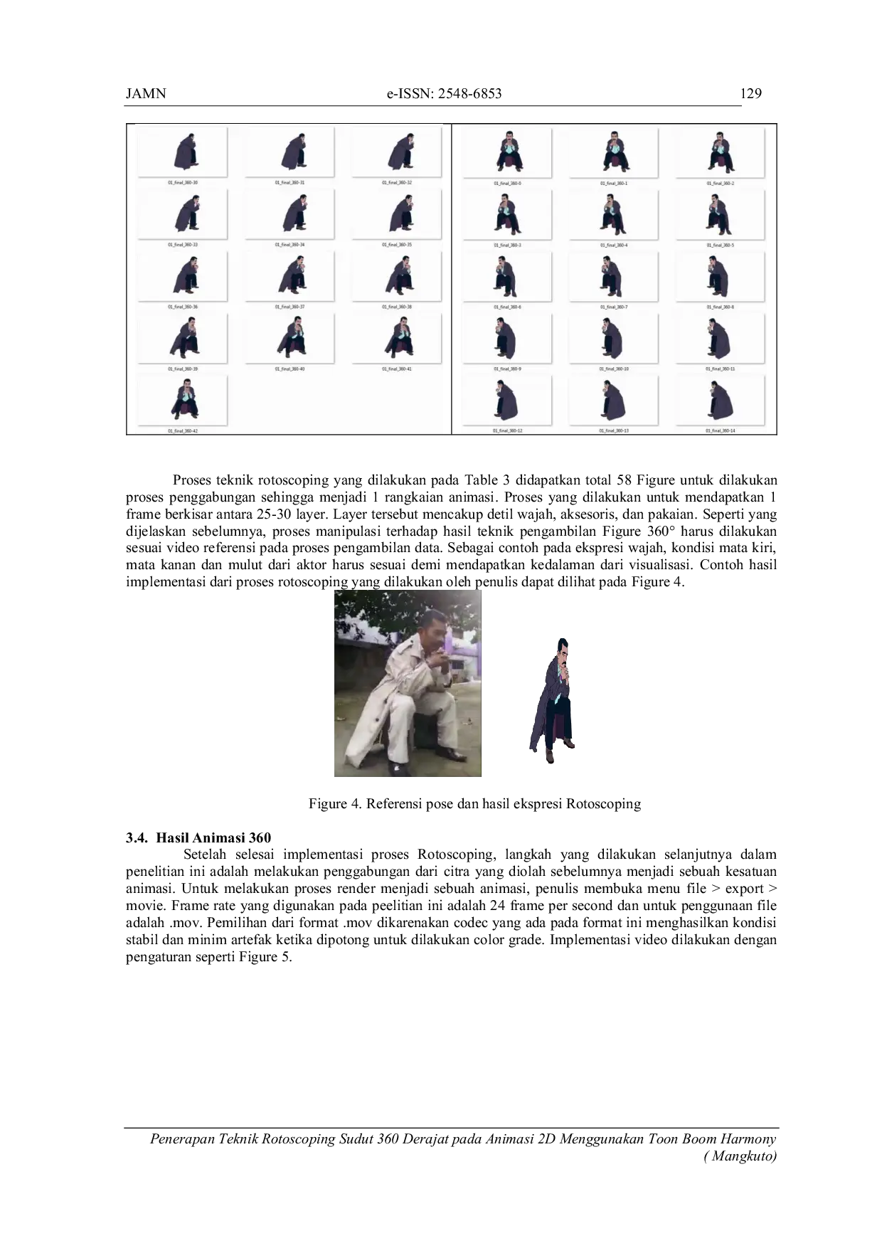 JOURNAL OF APPLIED MULTIMEDIA AND NETWORKINGJOURNAL OF APPLIED MULTIMEDIA AND NETWORKINGDalam era digital saat ini, animasi modern menjadi suatu disiplin yang mengintegrasikan unsur seni dan teknologi. Animasi memiliki prinsip dasar seperti slow in-out, squash and stretch, anticipation, dan staging. Teknik rotoscoping memungkinkan animator untuk meniru gerakan manusia secara presisi dengan merekam video gerakan nyata. Seiring dengan kebutuhan visual yang berkembang, teknik motion capture muncul untuk merekam gerakan 360 derajat. Studi ini fokus pada penerapan teknik rotoscoping 360 derajat pada animasi 2D menggunakan Toon Boom Harmony. Hasil penelitian dari kuesioner 10 responden profesional menyatakan bahwa teknik ini mendapatkan nilai keseluruhan 78,89% dalam kategori baik, menunjukkan efektivitas Toon Boom Harmony dalam mendukung implementasi teknik 360 derajat.