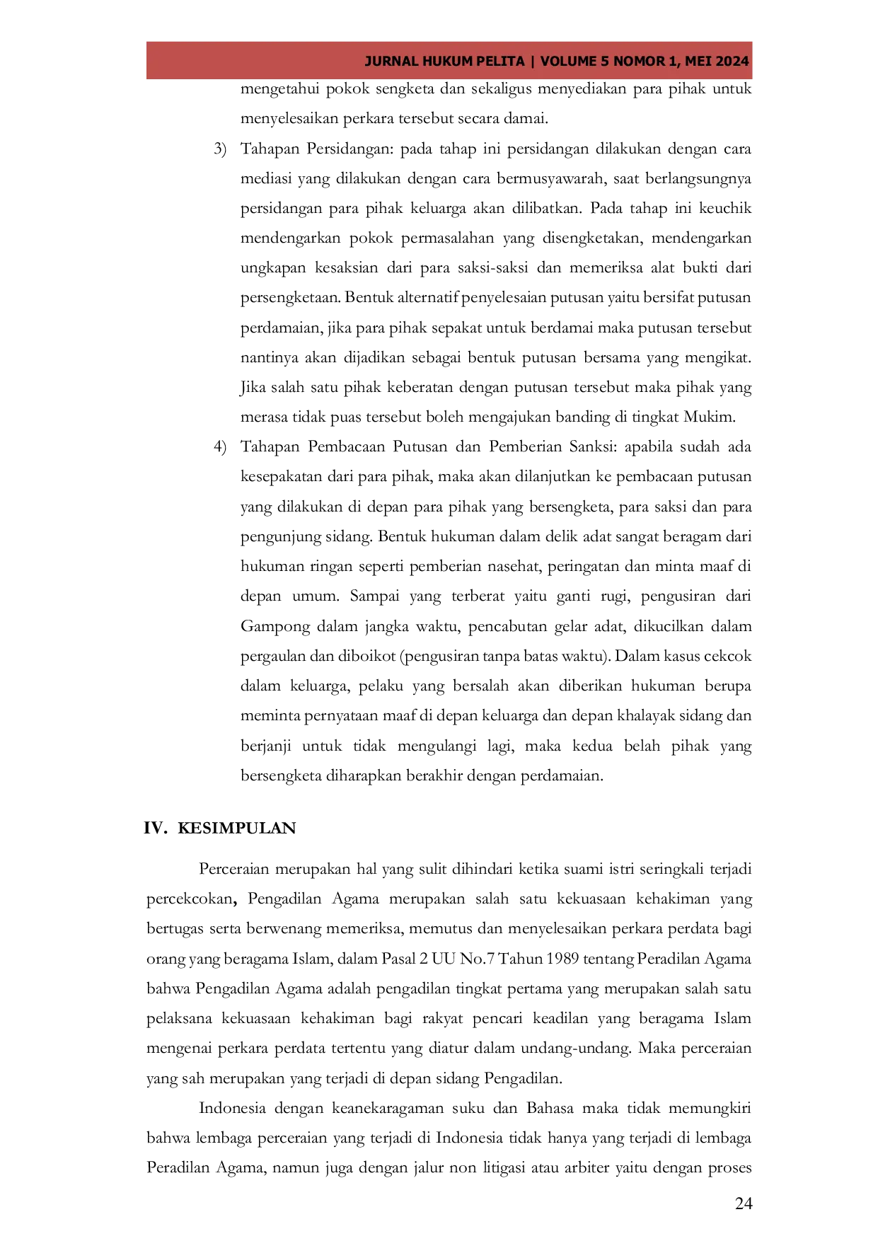 Perceraian merupakan hal yang sulit dihindari ketika suami istri seringkali terjadi percekcokan.Pengadilan Agama merupakan lembaga yang berwenang memeriksa dan memutus perkara perceraian.Selain lembaga peradilan, terdapat pula lembaga non-litigasi dan lembaga adat yang turut menyelesaikan sengketa perceraian, namun perlu adanya standarisasi prosedur dan kolaborasi dengan lembaga formal untuk memastikan kepastian hukum.