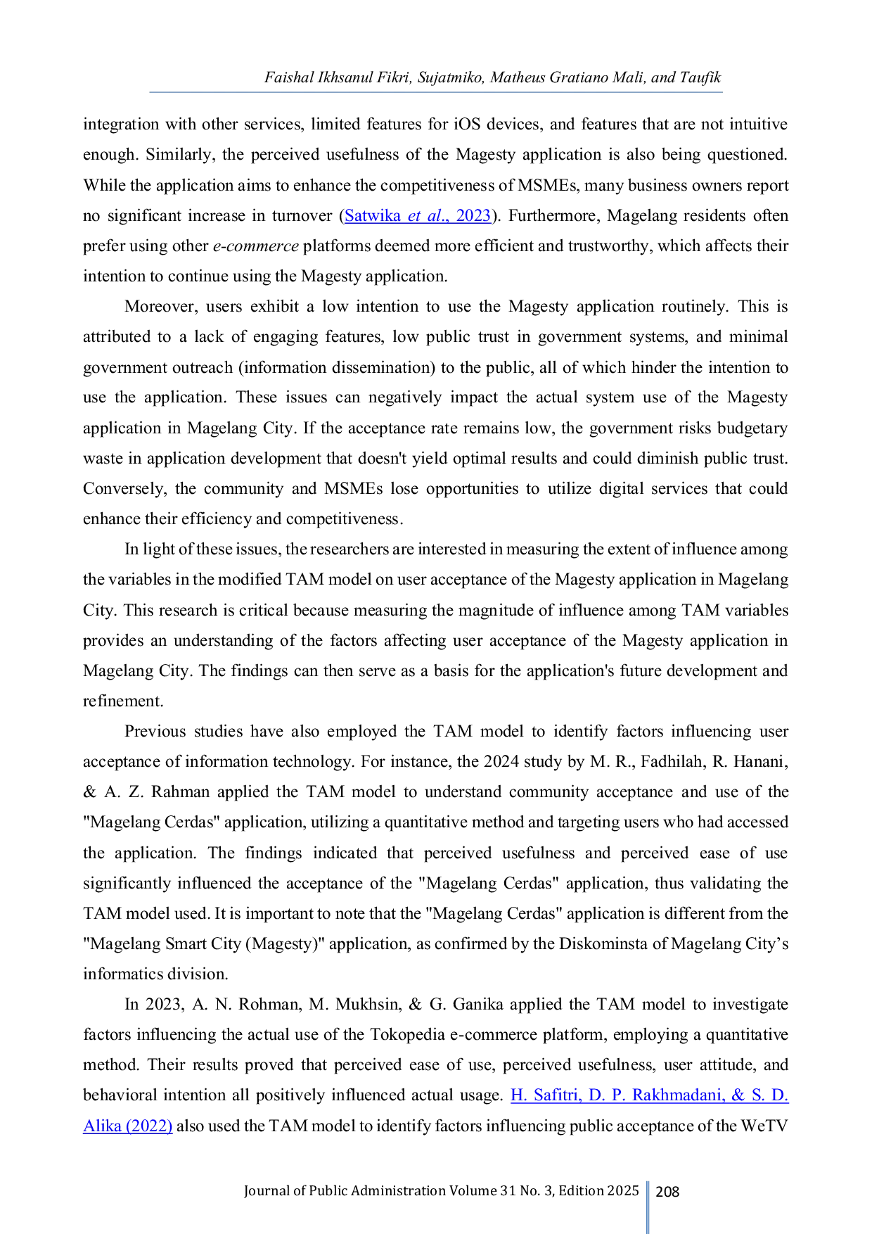 Berdasarkan hasil pengujian dan diskusi mengenai empat hipotesis dalam Model Penerimaan Teknologi (TAM), dapat disimpulkan bahwa semua hubungan antar variabel menunjukkan pengaruh positif dan signifikan, berkisar dari kuat hingga sedang, terhadap penerimaan pengguna terhadap aplikasi Magesty di Kota Magelang.Persepsi kemudahan penggunaan memiliki pengaruh sangat kuat (koefisien jalur=0,745 atau 74,5%) terhadap persepsi kegunaan, yang mengindikasikan bahwa kemudahan penggunaan, khususnya desain antarmuka dan navigasi, merupakan faktor utama dalam membentuk persepsi manfaat aplikasi, terutama untuk fitur-fitur dasar di kalangan masyarakat umum dan fitur Toko UMKM bagi pelaku usaha mikro.Selanjutnya, persepsi kegunaan memiliki pengaruh sedang (koefisien jalur=0,350 atau 35%) terhadap intensi perilaku untuk menggunakan, yang menunjukkan bahwa meskipun aplikasi dianggap bermanfaat, hal tersebut belum sepenuhnya mendorong penggunaan jangka panjang.Ika, intensi perilaku untuk menggunakan memiliki pengaruh sangat kuat (koefisien jalur=0,716 atau 71,6%) terhadap penggunaan sistem aktual.Oleh karena itu, secara keseluruhan, kemudahan penggunaan dan persepsi kegunaan merupakan faktor utama dalam membentuk intensi dan penggunaan aktual aplikasi Magesty.Pemerintah Kota Magelang perlu memperkuat dukungan infrastruktur, literasi digital, dan pengembangan aplikasi secara adaptif dan inklusif sesuai dengan kebutuhan masyarakat umum dan pelaku UMKM.