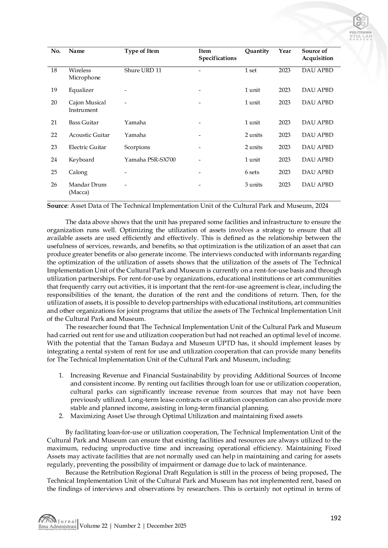 Jurnal Ilmu Administrasi: Media Pengembangan Ilmu dan Praktek AdministrasiJurnal Ilmu Administrasi: Media Pengembangan Ilmu dan Praktek AdministrasiAsset optimization in asset management seeks to maximize an assets physical, legal, and economic potential through proper management, procedures, and utilization. The Technical Implementation Unit of the Cultural Park and Museum of the Regional Education and Culture Agency of West Sulawesi Province has not yet conducted asset valuation or implemented leasing mechanisms, resulting in suboptimal revenue generation. This study examines how asset optimization can be strengthened through improved management, procedural implementation, and utilization forms. Using a qualitative descriptive design, data were collected through interviews, observation, and documentation involving eight informants. Findings indicate that planning, asset utilization, lending, and cooperation-based utilization have been implemented, although not yet supported by valuation and leasing practices. The study recommends conducting asset valuations, formalizing lease implementation, and integrating leasing with lending and cooperation systems to enhance revenue. Proper adoption of these strategies can position the Unit as a more productive cultural service institution.