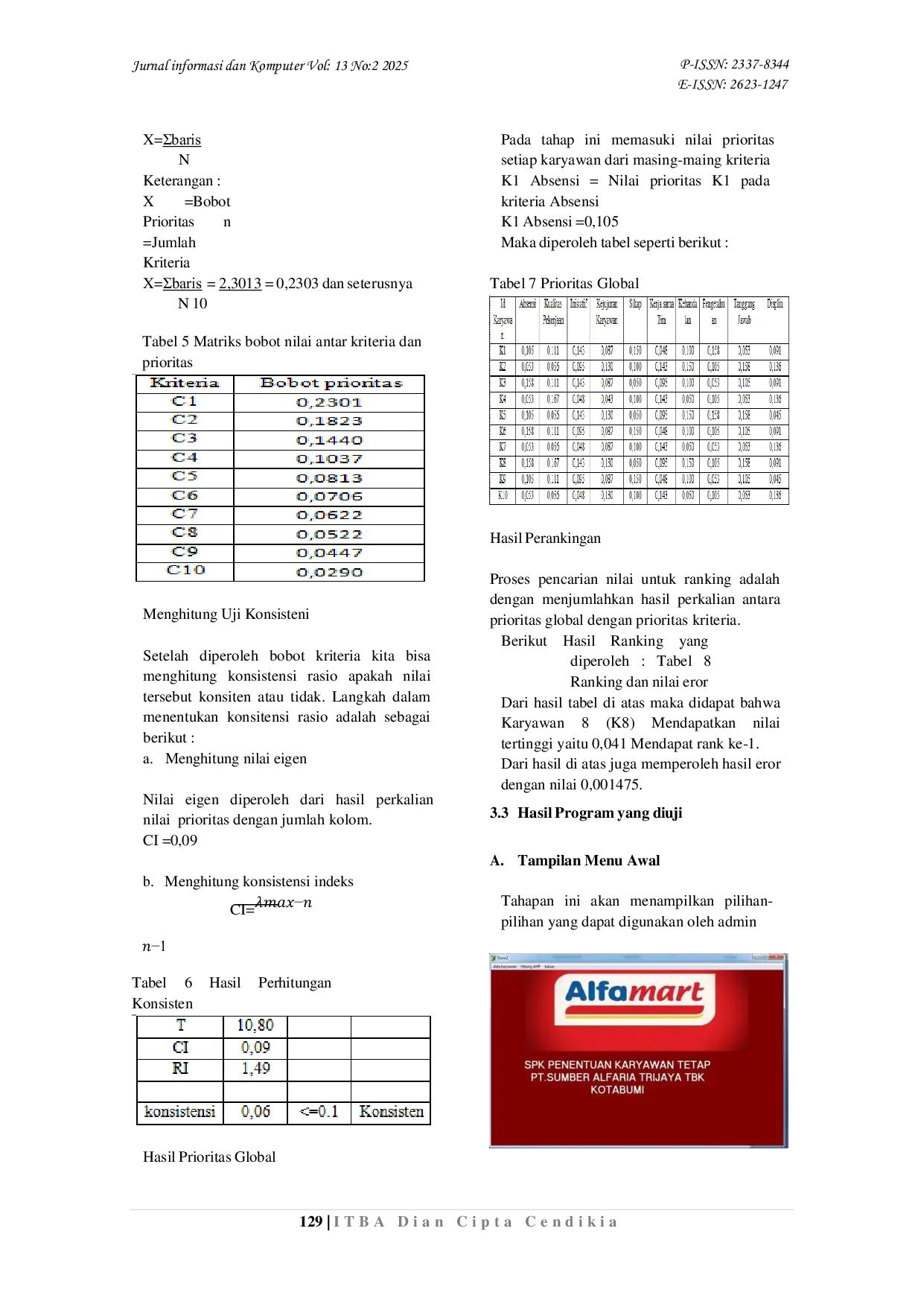 Jurnal Informasi dan KomputerJurnal Informasi dan KomputerPengambilan Keputusan dalam penerapan sistem pendukung keputusan penentuan karyawan tetap menggunakan metode AHP. Hal ini didasarkan pada keunggulan dari segi proses pengambilan keputusan untuk aribut-atribut baik kuantitatif maupun kualitatif. Selain itu, sistem pengambilan keputusan AHP menghasilkan hasil yang lebih baik dan konsisten daripada metode lainnya serta sistem dengan metode ini mudah dipahami dan mudah digunakan. Tujuan dari penelitian ini adalah membuat sebuah sistem pendukung keputusan yang dapat digunakan oleh PT. Sumber Alfaria Trijaya TBK Kotabumi dengan metode AHP (Analytical Hierarchy Process) sehingga dapat membantu pihak PT. Sumber Alfaria Trijaya TBK Kotabumi dalam pengambilan keputusan penentuan karyawan tetap. Menggunakan metode Waterfall sebagai solusi yang dilakukan pada saat penentuan, hasil yang diperoleh ialah penentuan karyawan tetap yang diperoleh dari perhitungan.