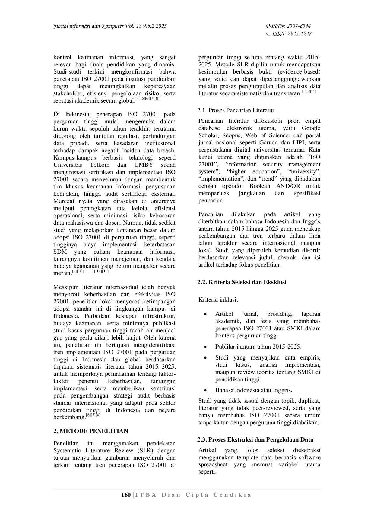 Jurnal Informasi dan KomputerJurnal Informasi dan KomputerKeamanan informasi menjadi aspek penting dalam tata kelola teknologi informasi di perguruan tinggi, terutama dengan meningkatnya ketergantungan terhadap sistem digital dan data akademik. ISO 27001 sebagai standar internasional untuk Sistem Manajemen Keamanan Informasi (SMKI) memberikan kerangka kerja bagi organisasi untuk melindungi kerahasiaan, integritas, dan ketersediaan informasi. Penelitian ini bertujuan untuk mengidentifikasi tren implementasi ISO 27001 di lingkungan perguruan tinggi berdasarkan tinjauan literatur dari berbagai penelitian terdahulu. Metode yang digunakan adalah systematic literature review dengan pendekatan kualitatif terhadap artikel yang terbit antara tahun 2015–2025. Hasil kajian menunjukkan bahwa penerapan ISO 27001 di perguruan tinggi meningkat signifikan dalam lima tahun terakhir, terutama pada institusi yang memiliki kebijakan keamanan informasi dan dukungan manajemen yang kuat. Faktor utama keberhasilan implementasi meliputi komitmen pimpinan, budaya keamanan, serta ketersediaan sumber daya manusia yang kompeten. Studi ini memberikan kontribusi terhadap pemahaman akademik mengenai arah dan tantangan penerapan SMKI di sektor pendidikan tinggi.