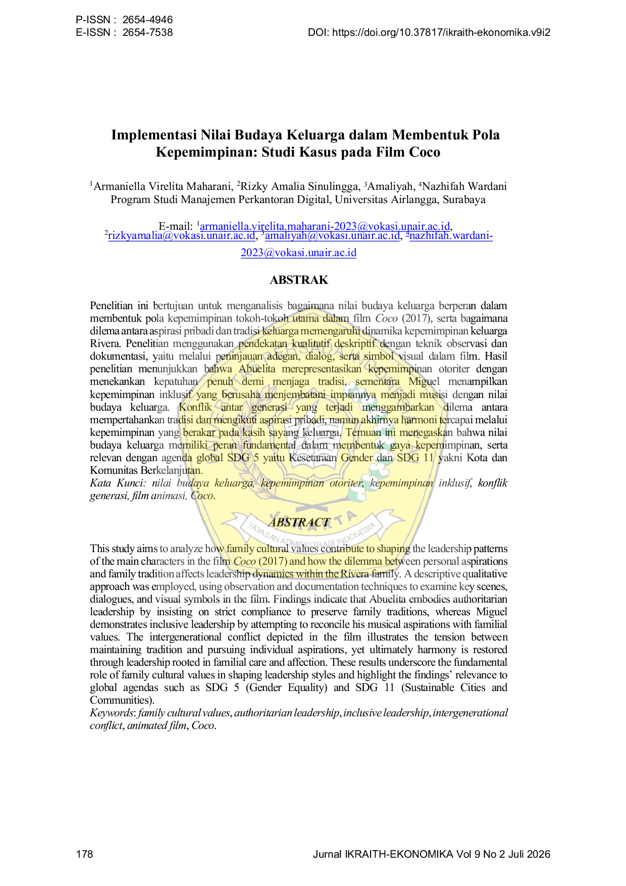 IKRAITH-EKONOMIKAIKRAITH-EKONOMIKAPenelitian ini bertujuan untuk menganalisis bagaimana nilai budaya keluarga berperan dalam membentuk pola kepemimpinan tokoh-tokoh utama dalam film Coco (2017), serta bagaimana dilema antara aspirasi pribadi dan tradisi keluarga memengaruhi dinamika kepemimpinan keluarga Rivera. Penelitian menggunakan pendekatan kualitatif deskriptif dengan teknik observasi dan dokumentasi, yaitu melalui peninjauan adegan, dialog, serta simbol visual dalam film. Hasil penelitian menunjukkan bahwa Abuelita merepresentasikan kepemimpinan otoriter dengan menekankan kepatuhan penuh demi menjaga tradisi, sementara Miguel menampilkan kepemimpinan inklusif yang berusaha menjembatani impiannya menjadi musisi dengan nilai budaya keluarga. Konflik antar generasi yang terjadi menggambarkan dilema antara mempertahankan tradisi dan mengikuti aspirasi pribadi, namun akhirnya harmoni tercapai melalui kepemimpinan yang berakar pada kasih sayang keluarga. Temuan ini menegaskan bahwa nilai budaya keluarga memiliki peran fundamental dalam membentuk gaya kepemimpinan, serta relevan dengan agenda global SDG 5 yaitu Kesetaraan Gender dan SDG 11 yakni Kota dan Komunitas Berkelanjutan.
