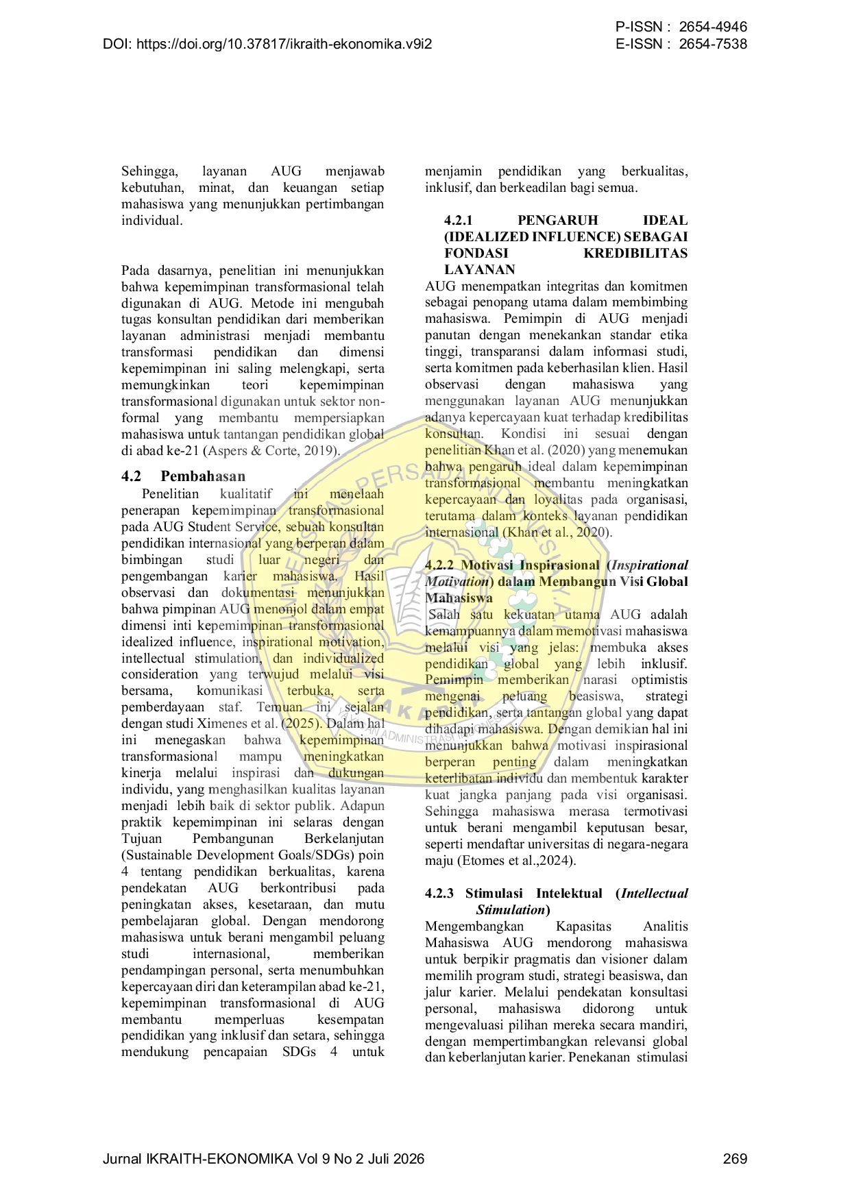 IKRAITH-EKONOMIKAIKRAITH-EKONOMIKAKepemimpinan transformasional mendorong perubahan dalam organisasi pendidikan global melalui inspirasi, pemberdayaan, dan inovasi. Namun, sebagian besar penelitian hanya menyoroti penerapannya di sekolah atau universitas, sedangkan sektor konsultan pendidikan internasional masih jarang diteliti. Penelitian ini mengeksplorasi praktik kepemimpinan transformasional di AUG, konsultan pendidikan internasional yang menyediakan layanan bimbingan studi luar negeri. Pendekatan kualitatif naratif digunakan melalui observasi dan dokumentasi untuk menggali praktik kepemimpinan secara mendalam. Hasil menunjukkan penerapan empat dimensi kepemimpinan transformasional idealized influence, inspirational motivation, intellectual stimulation, dan individualized consideration tercermin dalam visi global, komunikasi terbuka, pemberdayaan staf, dan pendampingan personal mahasiswa. Praktik ini memperkuat kepercayaan, meningkatkan kemampuan analitis mahasiswa, serta menciptakan iklim inovatif yang relevan dengan tantangan pendidikan abad ke-21. Dampaknya terlihat pada peningkatan kesiapan mahasiswa menghadapi kompetisi global dan keberhasilan AUG mempertahankan layanan berkualitas di pasar kompetitif. Studi ini memperluas literatur kepemimpinan dengan menerapkan teori transformasional pada sektor konsultan pendidikan nonformal serta merekomendasikan penelitian lanjutan untuk menilai dampak jangka panjang pada karier alumni dan adaptasi model dalam konteks pendidikan digital serta multikultural.