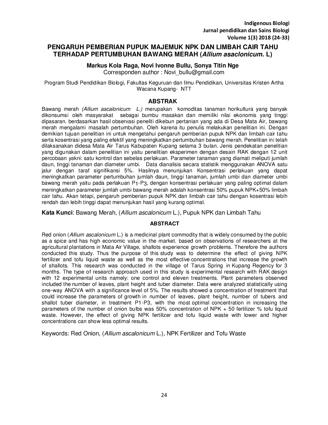INDIGENOUS BIOLOGI : JURNAL PENDIDIKAN DAN SAINS BIOLOGIINDIGENOUS BIOLOGI : JURNAL PENDIDIKAN DAN SAINS BIOLOGIBawang merah (Allium ascalonicum L.) merupakan komoditas tanaman hortikultura yang banyak dikonsumsi masyarakat sebagai bumbu masakan dan memiliki nilai ekonomis tinggi di pasaran. Berdasarkan observasi peneliti di kebun pertanian di Desa Mata Air, bawang merah mengalami masalah pertumbuhan. Penelitian ini bertujuan untuk mengetahui pengaruh pemberian pupuk NPK dan limbah cair tahu serta konsentrasi yang paling efektif untuk meningkatkan pertumbuhan bawang merah. Penelitian ini dilaksanakan di Desa Mata Air Tarus, Kabupaten Kupang selama 3 bulan, menggunakan pendekatan eksperimen dengan desain RAk dan 12 unit percobaan. Parameter tanaman yang diamati meliputi jumlah daun, tinggi tanaman, dan diameter umbi. Data dianalisis secara statistik menggunakan ANOVA satu jalur dengan taraf signifikansi 5%. Hasil penelitian menunjukkan bahwa konsentrasi perlakuan yang dapat meningkatkan parameter pertumbuhan (jumlah daun, tinggi tanaman, jumlah umbi, dan diameter umbi) adalah pada perlakuan P1-P3, dengan konsentrasi optimal untuk meningkatkan jumlah umbi bawang merah adalah 50% pupuk NPK 50% limbah cair tahu. Namun, pemberian pupuk NPK dan limbah cair tahu dengan konsentrasi lebih rendah atau lebih tinggi dapat memberikan hasil yang kurang optimal.