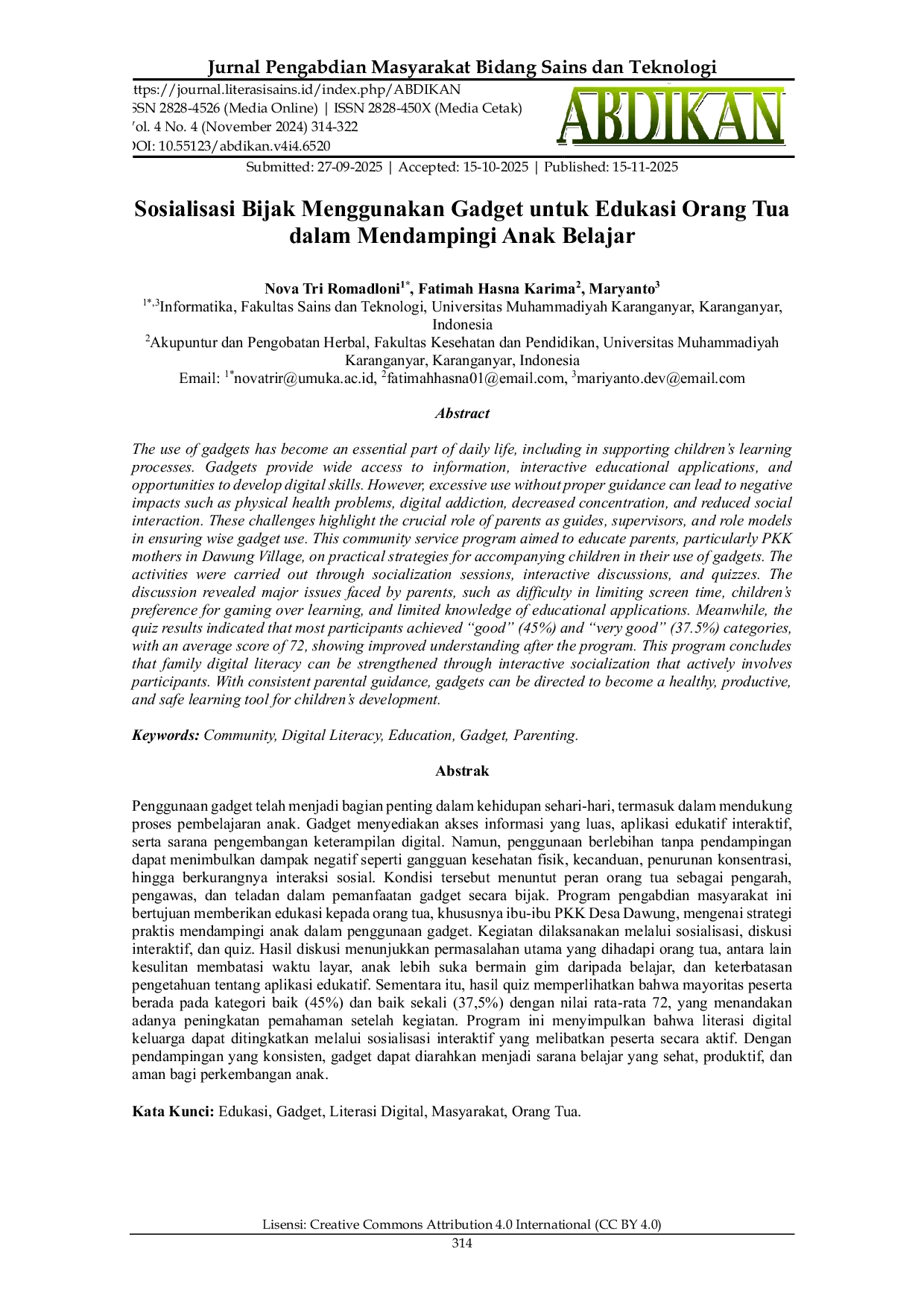 ABDIKAN: Jurnal Pengabdian Masyarakat Bidang Sains dan TeknologiABDIKAN: Jurnal Pengabdian Masyarakat Bidang Sains dan TeknologiPenggunaan gadget telah menjadi bagian penting dalam kehidupan sehari-hari, termasuk dalam mendukung proses pembelajaran anak. Gadget menyediakan akses informasi yang luas, aplikasi edukatif interaktif, serta sarana pengembangan keterampilan digital. Namun, penggunaan berlebihan tanpa pendampingan dapat menimbulkan dampak negatif seperti gangguan kesehatan fisik, kecanduan, penurunan konsentrasi, hingga berkurangnya interaksi sosial.