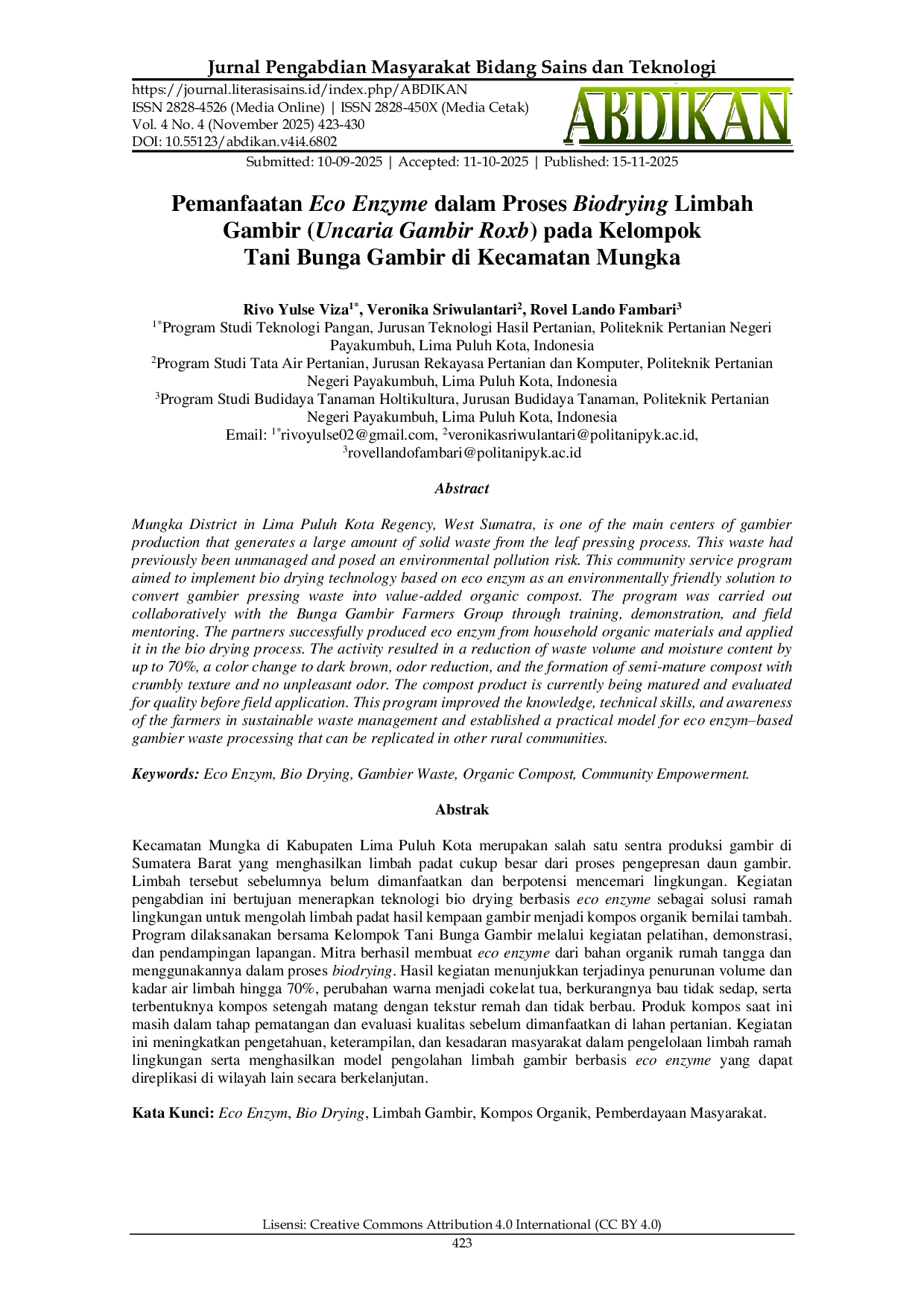 ABDIKAN: Jurnal Pengabdian Masyarakat Bidang Sains dan TeknologiABDIKAN: Jurnal Pengabdian Masyarakat Bidang Sains dan TeknologiKecamatan Mungka di Kabupaten Lima Puluh Kota merupakan salah satu sentra produksi gambir di Sumatera Barat yang menghasilkan limbah padat cukup besar dari proses pengepresan daun gambir. Limbah tersebut sebelumnya belum dimanfaatkan dan berpotensi mencemari lingkungan. Kegiatan pengabdian ini bertujuan menerapkan teknologi bio drying berbasis eco enzyme sebagai solusi ramah lingkungan untuk mengolah limbah padat hasil kempaan gambir menjadi kompos organik bernilai tambah. Program dilaksanakan bersama Kelompok Tani Bunga Gambir melalui kegiatan pelatihan, demonstrasi, dan pendampingan lapangan. Mitra berhasil membuat eco enzyme dari bahan organik rumah tangga dan menggunakannya dalam proses biodrying. Hasil kegiatan menunjukkan penurunan volume dan kadar air limbah hingga 70%, perubahan warna menjadi cokelat tua, berkurangnya bau tidak sedap, serta terbentuknya kompos setengah matang dengan tekstur remah dan tidak berbau. Produk kompos saat ini masih dalam tahap pematangan dan evaluasi kualitas sebelum dimanfaatkan di lahan pertanian. Kegiatan ini meningkatkan pengetahuan, keterampilan, dan kesadaran masyarakat dalam pengelolaan limbah ramah lingkungan serta menghasilkan model pengolahan limbah gambir berbasis eco enzyme yang dapat direplikasi di wilayah lain secara berkelanjutan.