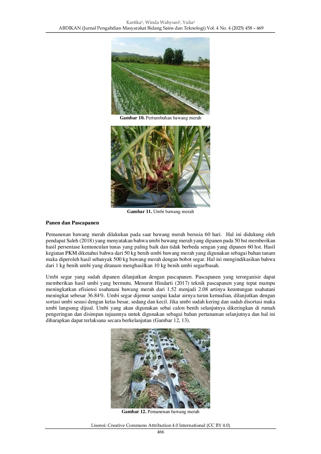 ABDIKAN: Jurnal Pengabdian Masyarakat Bidang Sains dan TeknologiABDIKAN: Jurnal Pengabdian Masyarakat Bidang Sains dan TeknologiKepulauan Bangka Belitung merupakan salah satu wilayah dengan tingkat konsumsi bawang merah yang tinggi. Hal ini tidak seimbang dengan jumlah produksi lokal bawang merah Pulau Bangka, sehingga membutuhkan suplai dari luar daerah. Kabupaten Bangka Tengah merupakan sentral produksi komoditas hortikultura khusus Pulau Bangka. Desa Air Mesu Timur memiliki potensi sebagai sentra produksi bawang merah di Pulau Bangka, namun pengembangannya terkendala oleh keterbatasan modal usaha, mutu benih yang rendah, dan penerapan standar operasional prosedur (SOP) budidaya yang belum optimal. Kelompok tani timur makmur merupakan salah satu produsen bawang merah di Desa Air Mesu Timur. Kegiatan ini bertujuan untuk mengembangkan penerapan SOP budidaya bawang merah serta memperbaiki hasil produksi petani lokal. Metode kegiatan yang dilakukan pada kegiatan ini meliputi Forum Group Discussion (FGD), penyediaan dan penyerahan sarana dan prasarana produksi, demplot budidaya bawang merah dan pemasaran bawang merah. Kegiatan pengabdian ini dilaksanakan dari bulan Juni hingga September 2025 di kebun Kelompok Tani Timur Makmur, Desa Air Mesu Timur. Hasil kegiatan menunjukkan bahwa minat petani terhadap pengembangan bawang merah meningkat, dan demplot mampu menghasilkan 500 kg umbi segar dari 50 kg benih, atau setara dengan rasio hasil 1:10. Hasil perhitungan analisis usahatani menunjukkan bahwa usaha budidaya bawang merah di Desa Air mesu timur menghasilkan rasio R/C 1,43. Hal ini menunjukkan bahwa usaha budidaya tersebut layak secara ekonomi, dengan margin keuntungan yang cukup baik. Berdasarkan kegiatan pengabdian ini diketahui bahwa penerapan SOP budidaya bawang merah spesifik Pulau Bangka dapat meningkatkan produksi dan produktivitas bawang merah di Pulau Bangka.