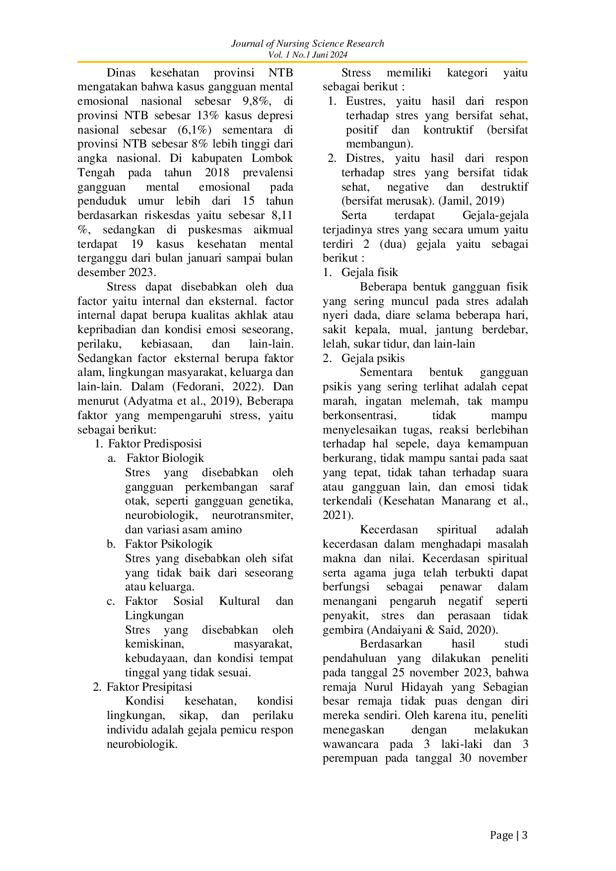 Journal Of Nursing Science ResearchJournal Of Nursing Science ResearchPenelitian ini bertujuan untuk mengetahui pengaruh kecerdasan spiritual terhadap stres pada remaja di musholla nurul hidayah. Penelitian ini menggunakan pendekatan kuantitatif dengan desain non-eksperimen. Populasi penelitian adalah seluruh remaja di musholla nurul hidayah dan sampel berjumlah 24 orang yang diambil menggunakan rumus slovin dengan teknik sampel simple random sampling. Metode pengambilan data menggunakan kuesioner SWBS dan DASS-21. Analisis data menggunakan analisis chi-square. Hasil penelitian menunjukkan terdapat pengaruh kecerdasan spiritual terhadap stres dengan bukti ρ value = 0,009 < α = 0,05, sehingga terdapat pengaruh yang signifikan antara kecerdasan spiritual terhadap tingkat stres pada remaja musholla nurul hidayah. Semakin tinggi kecerdasan spiritual remaja maka semakin rendah tingkat stres seseorang.