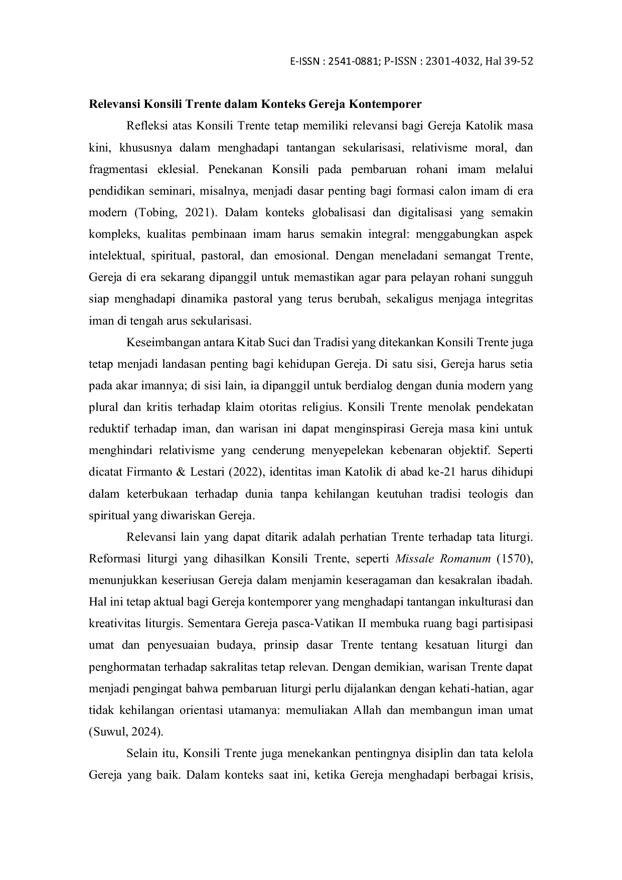 Sepakat : Jurnal Pastoral KateketikSepakat : Jurnal Pastoral KateketikPenelitian ini membahas Konsili Trente (1545–1563) sebagai respons resmi Gereja Katolik terhadap Reformasi Protestan sekaligus tonggak pembaruan internal. Fokus kajian diarahkan pada ketegangan teologis dan historis antara kritik reformator terhadap Kitab Suci, sakramen, dan otoritas Gereja, serta tuntutan pembaruan dari dalam Gereja sendiri.