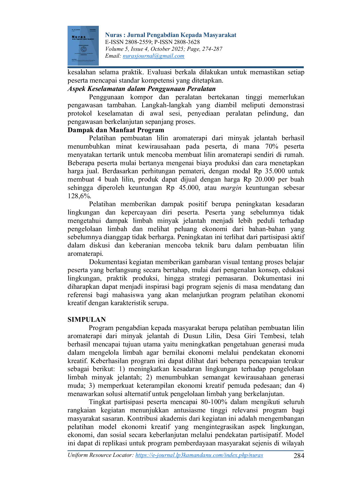 Nuras : Jurnal Pengabdian Kepada MasyarakatNuras : Jurnal Pengabdian Kepada MasyarakatPengembangan ekonomi kreatif melalui pelatihan pemanfaatan limbah minyak jelantah menjadi lilin aromaterapi dilaksanakan di Dusun Lilin, Desa Giri Tembesi, dari tanggal 25 Juni hingga 9 Agustus 2025. Program pengabdian kepada masyarakat ini dirancang untuk meningkatkan kemampuan generasi muda berusia 12-22 tahun dalam mengelola limbah agar bernilai ekonomi melalui pendekatan berbasis pelatihan. Metode yang diterapkan meliputi observasi, ceramah, dan praktik langsung yang melibatkan 22 peserta. Program pelatihan ini terdiri dari empat tahap utama, yaitu: 1) pengenalan program dan konsep ekonomi kreatif; 2) pemberian materi mengenai limbah minyak jelantah; 3) pelatihan pembuatan lilin aromaterapi; dan 4) teknik pengemasan dan pemasaran produk. Evaluasi dilakukan melalui observasi langsung terhadap keterampilan praktik peserta dan diskusi interaktif untuk mengukur pemahaman materi serta minat kewirausahaan. Hasil kegiatan menunjukkan bahwa 85% peserta mampu memahami proses produksi lilin, 80% menguasai konsep dasar pengemasan, dan 70% menyatakan minat untuk mengembangkan usaha sendiri. Produk yang dihasilkan adalah empat lilin aromaterapi beraroma lavender dengan waktu pembakaran 4-6 jam dan aroma yang tahan lama. Dari perspektif analisis ekonomi, potensi keuntungan mencapai Rp 45.000 dari investasi sebesar Rp 35.000 untuk empat lilin. Pelaksanaan program ini terbukti efektif dalam meningkatkan kesadaran lingkungan, menumbuhkan semangat kewirausahaan, dan memperkuat keterampilan ekonomi kreatif pemuda pedesaan, sekaligus menawarkan solusi alternatif untuk pengelolaan limbah yang berkelanjutan.