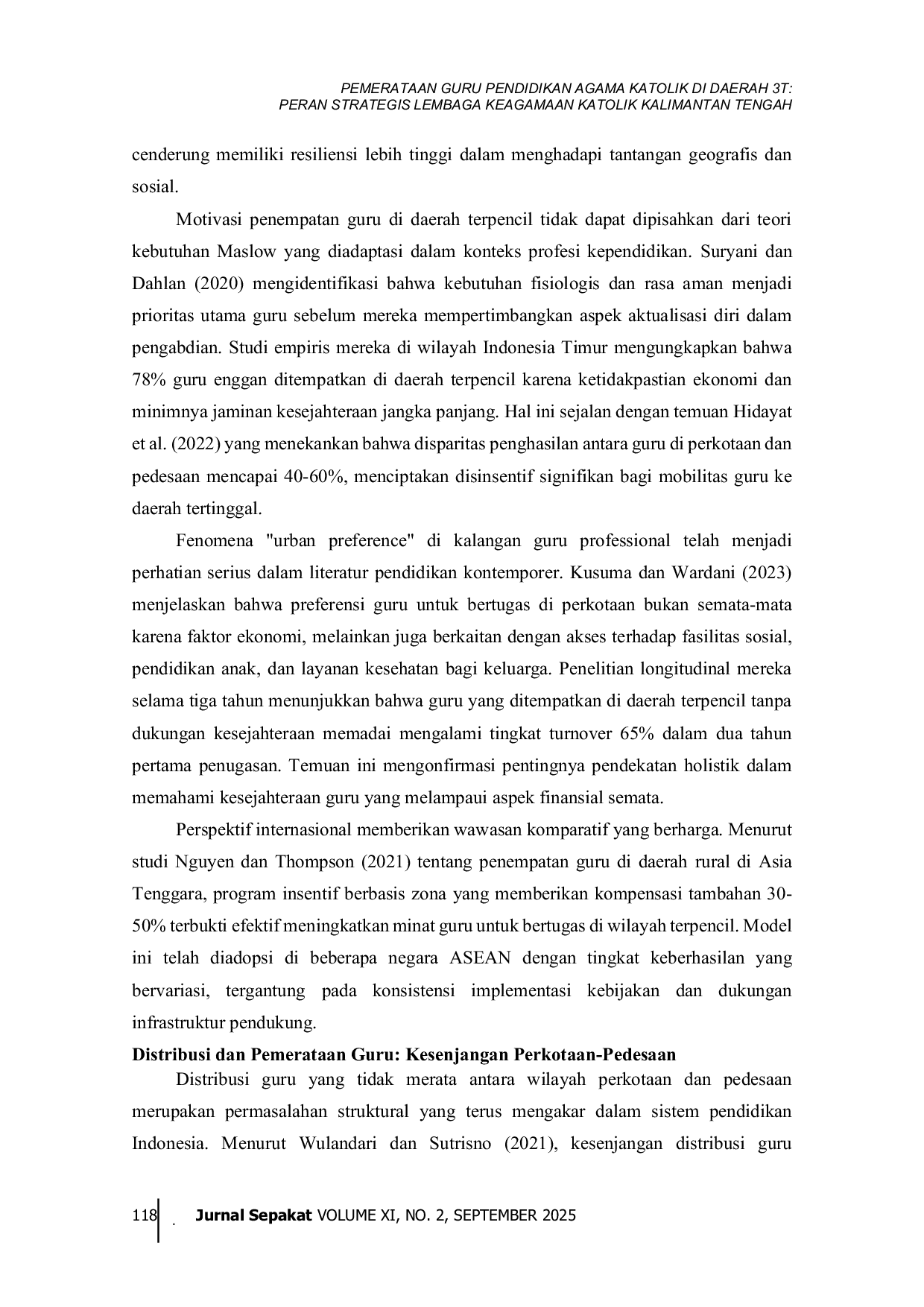 Penelitian ini mengungkapkan kompleksitas permasalahan penempatan Guru Pendidikan Agama Katolik di Provinsi Kalimantan Tengah yang dipengaruhi oleh berbagai faktor saling terkait.Temuan utama menunjukkan bahwa keengganan guru untuk ditempatkan di daerah terpencil bukan disebabkan oleh faktor tunggal, melainkan merupakan resultante dari pertimbangan multidimensional yang mencakup aspek ekonomi, sosial, dan infrastruktural.