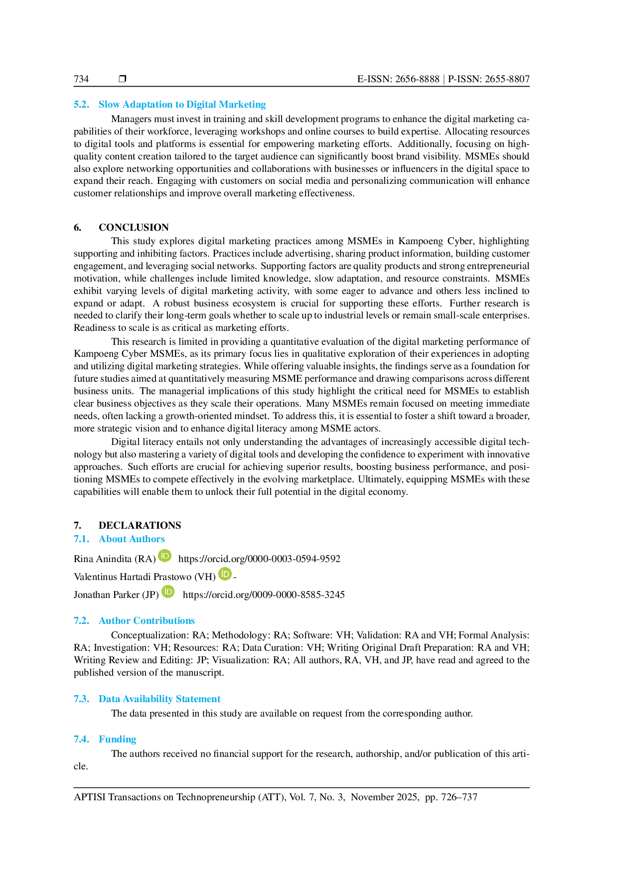 Keberhasilan MSME-s di Kampoeng Cyber Jogja dalam memanfaatkan digital marketing melalui media sosial perlu didukung oleh investasi dalam pendidikan digital untuk meningkatkan keterampilan Digital Marketing. User training dapat membantu mereka memahami strategi digital marketing yang efektif. Sementara itu, perlu dilakukan penelitian lebih lanjut mengenai dampak jangka panjang penggunaan digital marketing untuk mendukung pertumbuhan MSME-s. Selain itu, perlu dikembangkan riset tentang integrasi digital marketing dengan aspek kultur, dan partisipasi masyarakat dalam mempromosikan produk-produk lokal, agar MSME-s bisa meningkatkan daya saingnya dalam pasar global.