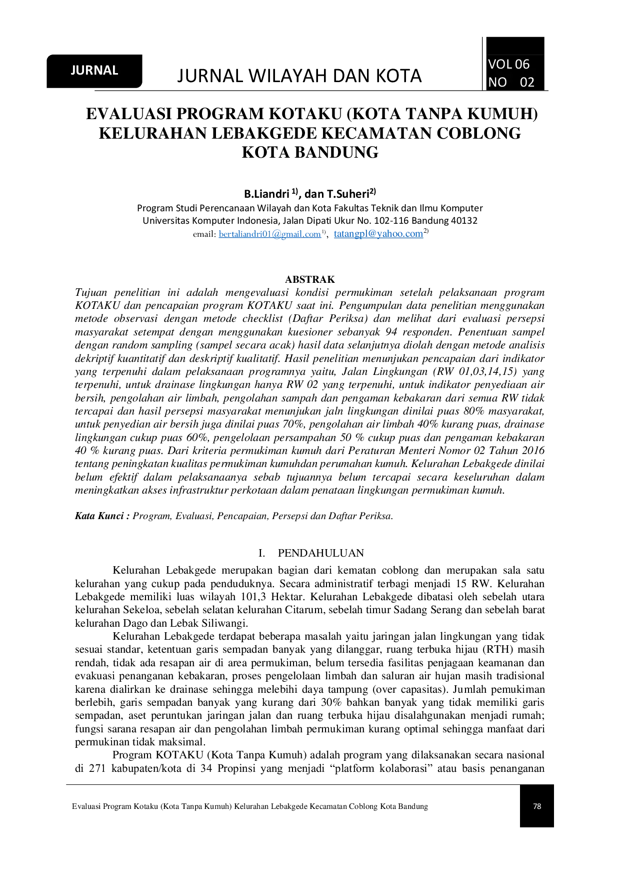 Jurnal Wilayah dan KotaJurnal Wilayah dan KotaTujuan penelitian ini adalah mengevaluasi kondisi permukiman setelah pelaksanaan program KOTAKU dan pencapaian program KOTAKU saat ini. Pengumpulan data penelitian menggunakan metode observasi dengan metode checklist (Daftar Periksa) dan melihat dari evaluasi persepsi masyarakat setempat dengan menggunakan kuesioner sebanyak 94 responden. Penentuan sampel dengan random sampling (sampel secara acak) hasil data selanjutnya diolah dengan metode analisis de kriptif kuantitatif dan deskriptif kualitatif. Hasil penelitian menunjukan pencapaian dari indikator yang terpenuhi dalam pelaksanaan programnya yaitu, Jalan Lingkungan (RW 01,03,14,15) yang terpenuhi, untuk drainase lingkungan hanya RW 02 yang terpenuhi, untuk indikator penyediaan air bersih, pengolahan air limbah, pengolahan sampah dan pengaman kebakaran dari semua RW tidak tercapai dan hasil persepsi masyarakat menunjukan jalan lingkungan dinilai puas 80% masyarakat, untuk penyedian air bersih juga dinilai puas 70%, pengolahan air limbah 40% kurang puas, drainase lingkungan cukup puas 60%, pengelolaan persampahan 50 % cukup puas dan pengaman kebakaran 40 % kurang puas. Dari kriteria permukiman kumuh dari Peraturan Menteri Nomor 02 Tahun 2016 tentang peningkatan kualitas permukiman kumuhdan perumahan kumuh. Kelurahan Lebakgede dinilai belum efektif dalam pelaksanaanya sebab tujuannya belum tercapai secara keseluruhan dalam meningkatkan akses infrastruktur perkotaan dalam penataan lingkungan permukiman kumuh.