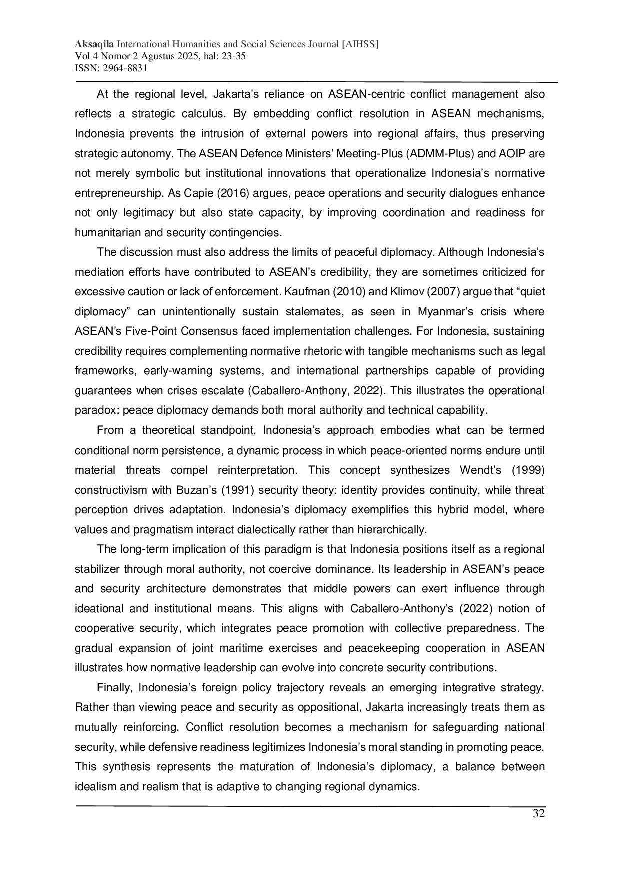 Kebijakan luar negeri Indonesia di ASEAN merefleksikan sintesis yang kompleks antara komitmen normatif dan adaptasi pragmatis.Paradigma perdamaian Indonesia berfungsi sebagai kompas moral dan kerangka strategis, namun juga dihadapkan pada tantangan keamanan dan ketidakpastian di kawasan.