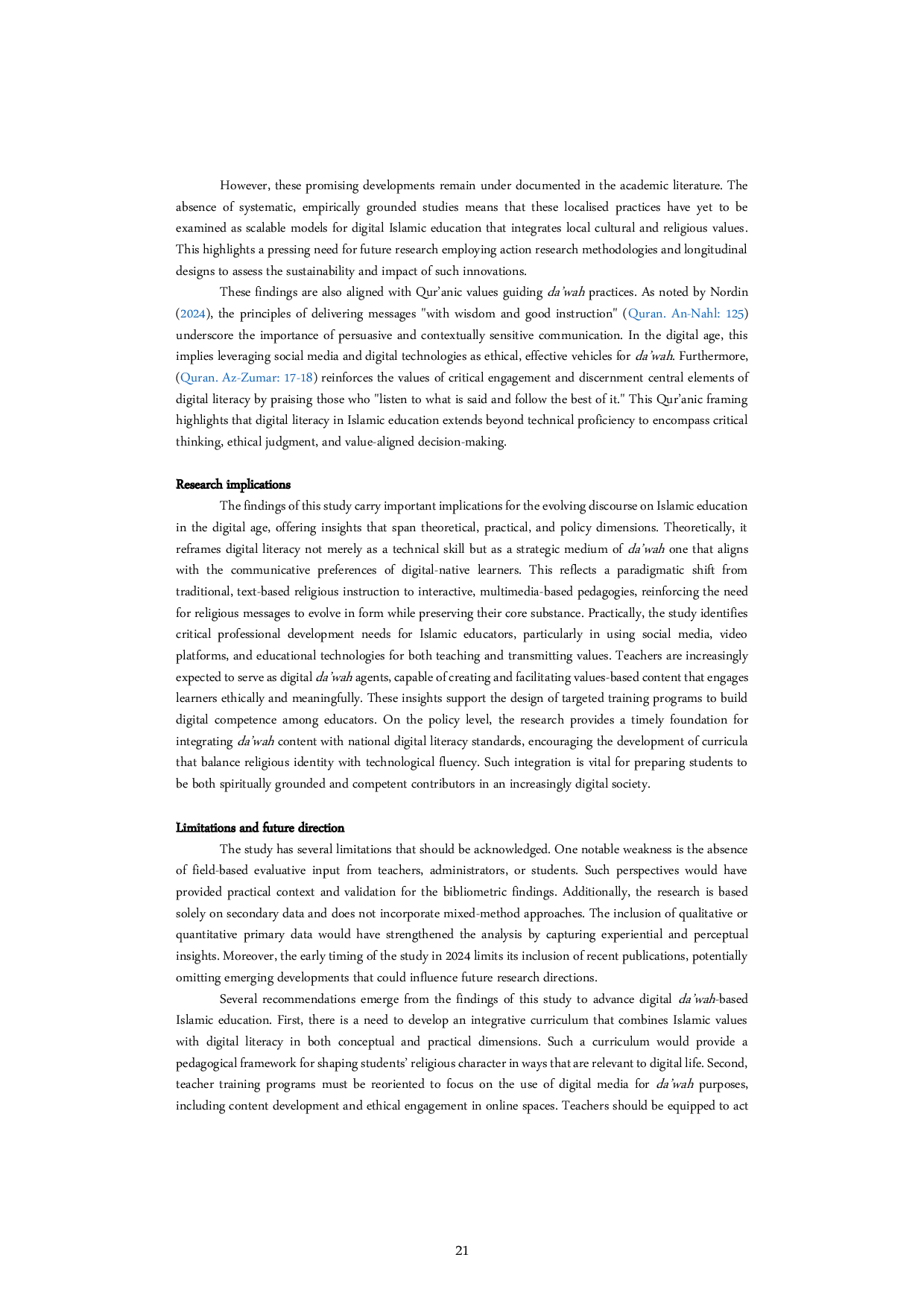 Future research should focus on developing an integrated curriculum that combines Islamic values with digital literacy, providing a pedagogical framework for shaping students religious character in the digital age. Furthermore, teacher training programs must be reoriented to emphasize the use of digital media for dawah, equipping educators to act as moral exemplars in online spaces. Finally, field-based, evaluative studies are needed to assess the impact and effectiveness of these digital education strategies, fostering collaboration between researchers, practitioners, and policymakers to create scalable and contextually responsive programs. These efforts will ensure that Islamic education not only embraces technological advancements but also remains grounded in its core values, preparing students to be both digitally competent and morally responsible citizens. Such research will also help to address the current gap in understanding how to effectively evaluate the long-term outcomes of digital dawah initiatives, providing evidence-based insights for policy development and curriculum refinement. This holistic approach will contribute to a more robust and sustainable integration of digital technologies within the framework of Islamic education.
