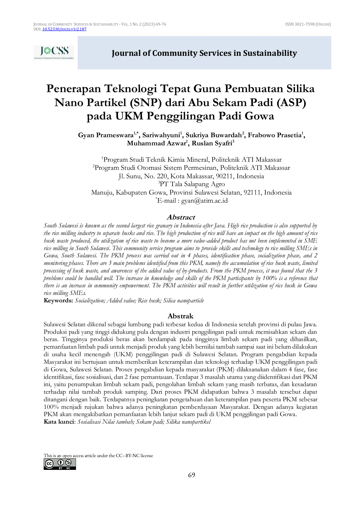 Journal of Community Services in SustainabilityJournal of Community Services in SustainabilitySulawesi Selatan dikenal sebagai lumbung padi terbesar kedua di Indonesia setelah provinsi di pulau Jawa. Produksi padi yang tinggi didukung pula dengan industri penggilingan padi untuk memisahkan sekam dan beras. Tingginya produksi beras akan berdampak pada tingginya limbah sekam padi yang dihasilkan, pemanfaatan limbah padi untuk menjadi produk yang lebih bernilai tambah sampai saat ini belum dilakukan di usaha kecil menengah (UKM) penggilingan padi di Sulawesi Selatan.