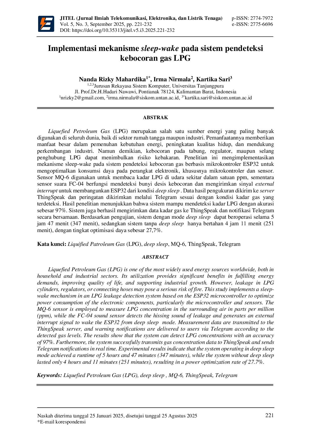 - Implementasi mekanisme sleep-wake pada sistem pendeteksi kebocoran gas LPG | JITEL (Jurnal Ilmiah Telekomunikasi,... doi.org/10.35313/jitel.v5.i3.2025.221-232Implementasi mekanisme sleep wake pada sistem pendeteksi kebocoran gas LPG JITEL Jurnal Ilmiah Telekomunikasi doi 10 35313 jitel v5 i3 2025 221 232