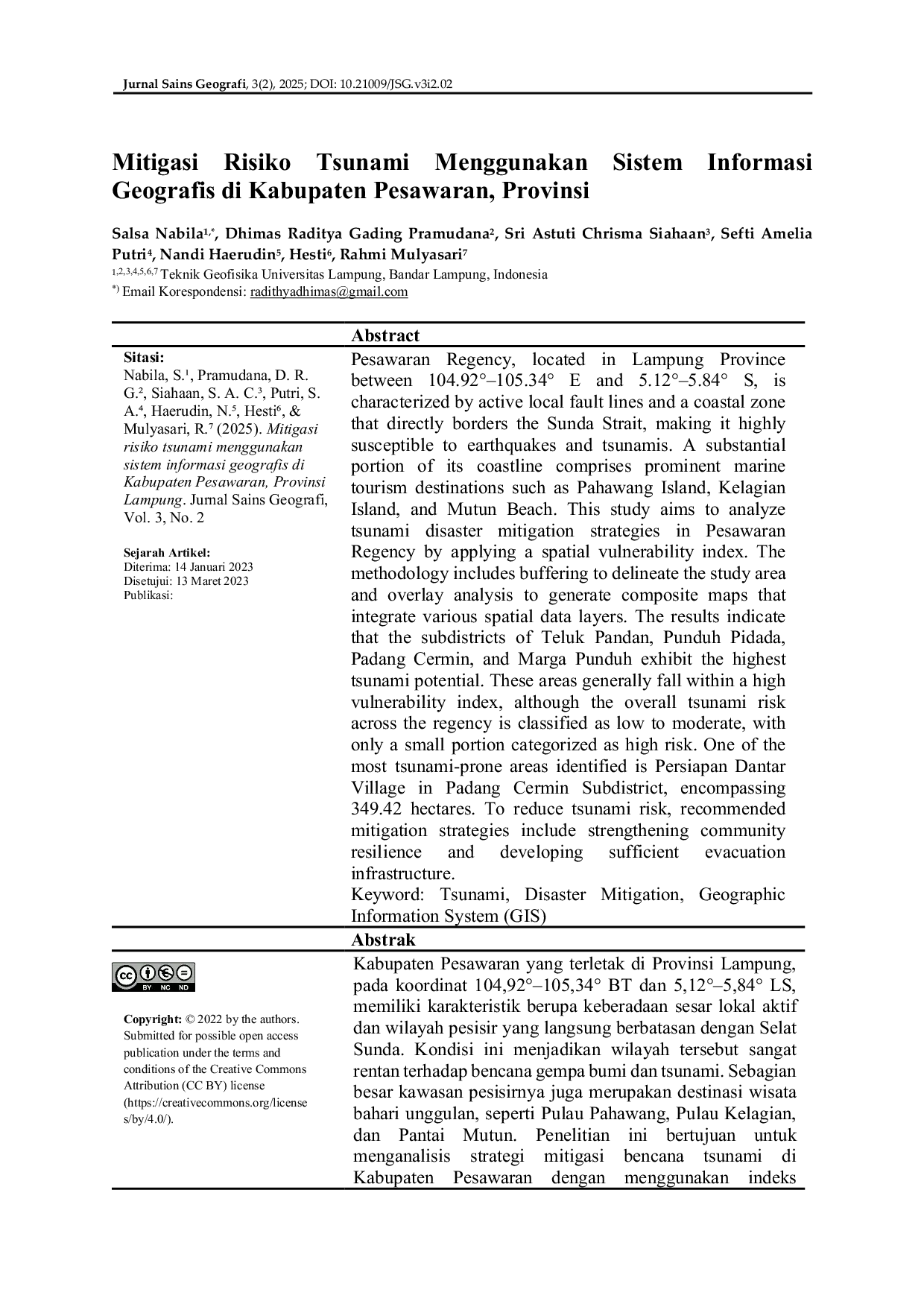 Penelitian ini berhasil memetakan tingkat risiko tsunami di Kabupaten Pesawaran dengan menggunakan SIG dan teknik overlay pada peta tematik seperti jarak pantai, jarak sungai, elevasi, dan kemiringan lereng.Analisis spasial mengidentifikasi kecamatan Teluk Pandan, Punduh Pidada, Padang Cermin, dan Marga Punduh sebagai daerah dengan potensi ancaman tsunami tinggi, dengan desa Persiapan Dantar sebagai wilayah berisiko tertinggi seluas 349,42 ha.Berdasarkan temuan tersebut direkomendasikan pembangunan jalur evakuasi, peningkatan literasi kebencanaan, dan penguatan infrastruktur serta ekosistem pesisir sebagai strategi mitigasi.