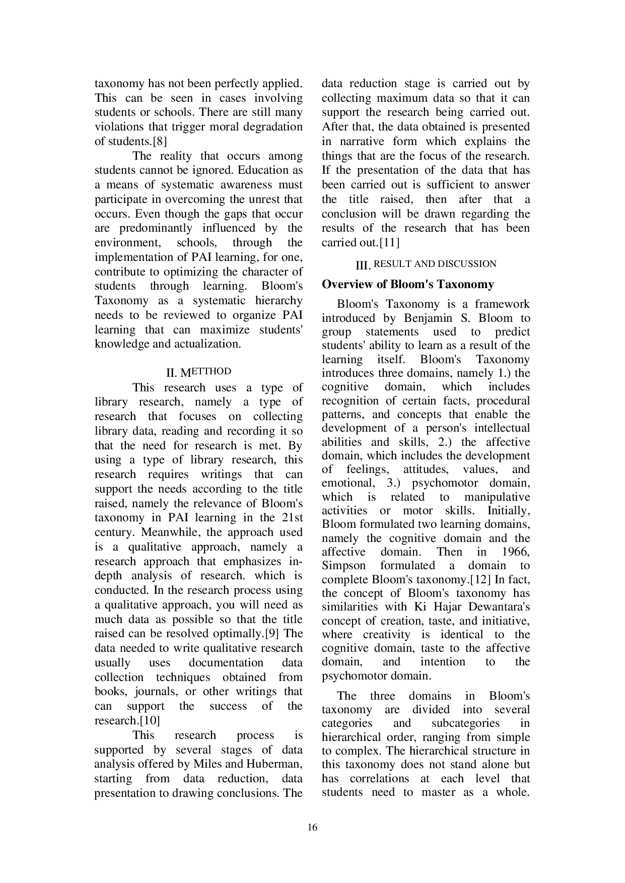 Penelitian ini menyimpulkan bahwa taksonomi Bloom tetap relevan dalam pembelajaran PAI di abad ke-21.Penerapan taksonomi Bloom dapat membantu guru merancang pembelajaran yang lebih terstruktur dan sistematis, sehingga dapat meningkatkan kemampuan kognitif, afektif, dan psikomotorik siswa.Selain itu, taksonomi Bloom juga dapat menjadi acuan bagi guru dalam mengukur tingkat pemahaman siswa terhadap materi pembelajaran.Dengan demikian, pembelajaran PAI dapat lebih efektif dalam mempersiapkan siswa untuk menghadapi tantangan di era digital.