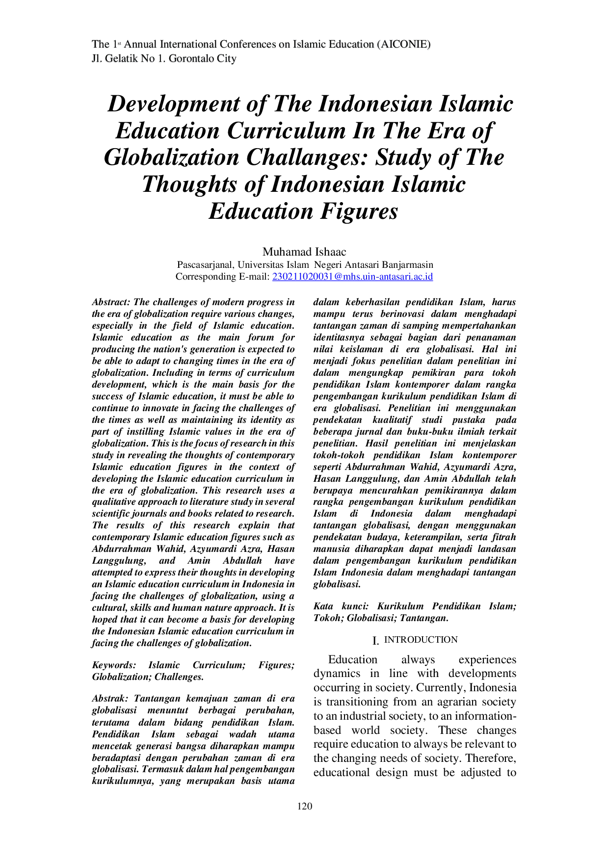 Proceeding of Annual International Conference on Islamic EducationProceeding of Annual International Conference on Islamic EducationTantangan kemajuan zaman di era globalisasi menuntut berbagai perubahan, terutama dalam bidang pendidikan Islam. Pendidikan Islam sebagai wadah utama mencetak generasi bangsa diharapkan mampu beradaptasi dengan perubahan zaman di era globalisasi. Termasuk dalam hal pengembangan kurikulumnya, yang merupakan basis utama keberhasilan pendidikan Islam, harus mampu terus berinovasi dalam menghadapi tantangan zaman di samping mempertahankan identitasnya sebagai bagian dari penanaman nilai keislaman di era globalisasi. Hal ini menjadi fokus penelitian dalam penelitian ini dalam mengungkap pemikiran para tokoh pendidikan Islam kontemporer dalam rangka pengembangan kurikulum pendidikan Islam di era globalisasi. Penelitian ini menggunakan pendekatan kualitatif studi pustaka pada beberapa jurnal dan buku-buku ilmiah terkait penelitian. Hasil penelitian ini menjelaskan tokoh-tokoh pendidikan Islam kontemporer seperti Abdurrahman Wahid, Azyumardi Azra, Hasan Langgulung, dan Amin Abdullah telah berupaya mencurahkan pemikirannya dalam rangka pengembangan kurikulum pendidikan Islam dalam menghadapi tantangan globalisasi, dengan menggunakan pendekatan budaya, keterampilan, serta fitrah manusia diharapkan dapat menjadi landasan dalam pengembangan kurikulum pendidikan Islam Indonesia dalam menghadapi tantangan globalisasi.