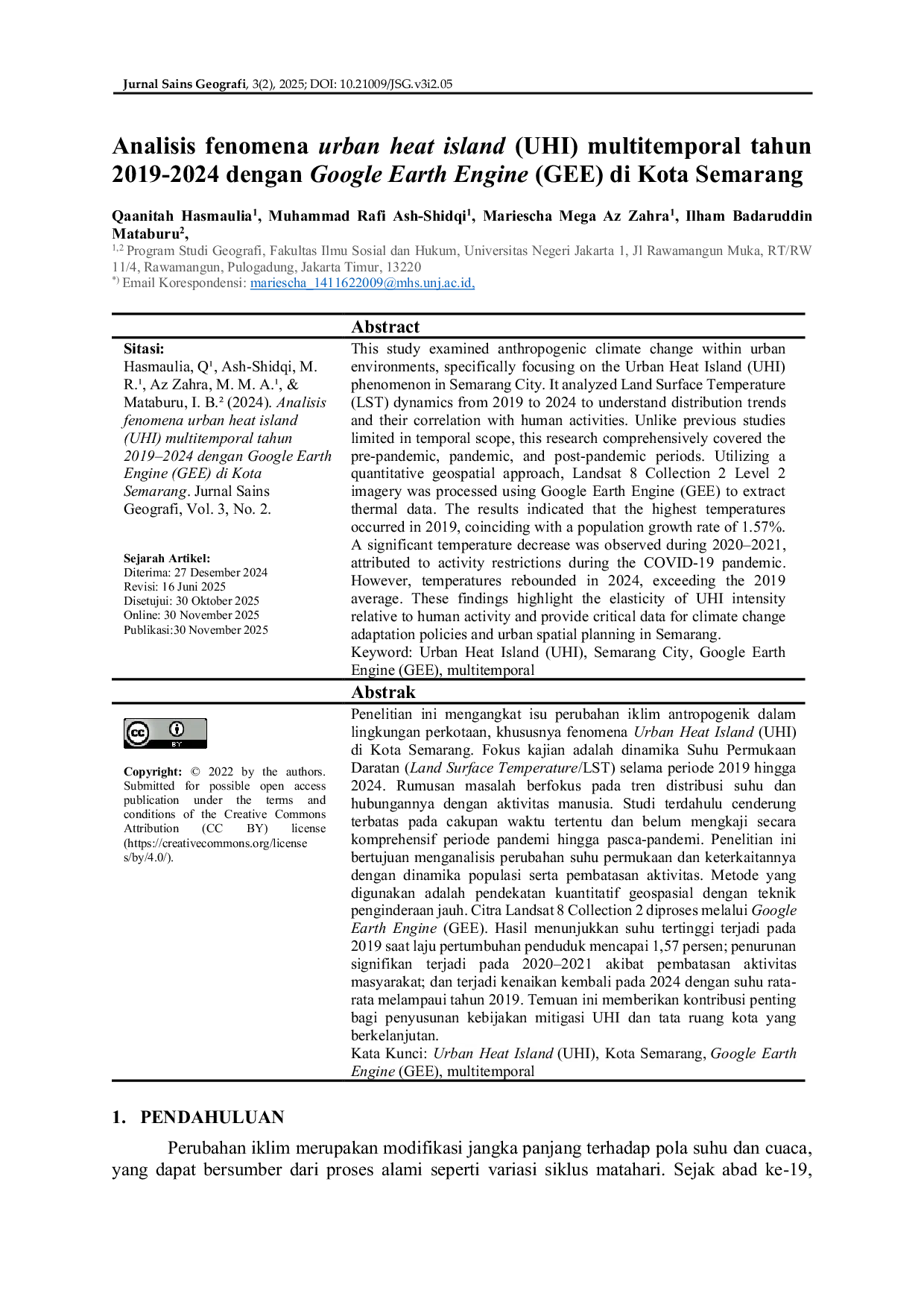 Jurnal Sains GeografiJurnal Sains GeografiPenelitian ini mengkaji perubahan iklim antropogenik dalam lingkungan perkotaan, khususnya fenomena Urban Heat Island (UHI) di Kota Semarang. Fokus kajian adalah dinamika Suhu Permukaan Daratan (Land Surface Temperature/LST) selama periode 2019 hingga 2024. Studi ini bertujuan menganalisis perubahan suhu permukaan dan keterkaitannya dengan dinamika populasi serta pembatasan aktivitas. Metode yang digunakan adalah pendekatan kuantitatif geospasial dengan teknik penginderaan jauh. Citra Landsat 8 Collection 2 diproses melalui Google Earth Engine (GEE). Hasil menunjukkan suhu tertinggi terjadi pada 2019 saat laju pertumbuhan penduduk mencapai 1,57 persen; penurunan signifikan terjadi pada 2020–2021 akibat pembatasan aktivitas masyarakat; dan terjadi kenaikan kembali pada 2024 dengan suhu rata-rata melampaui tahun 2019. Temuan ini memberikan kontribusi penting bagi penyusunan kebijakan mitigasi UHI dan tata ruang kota yang berkelanjutan.