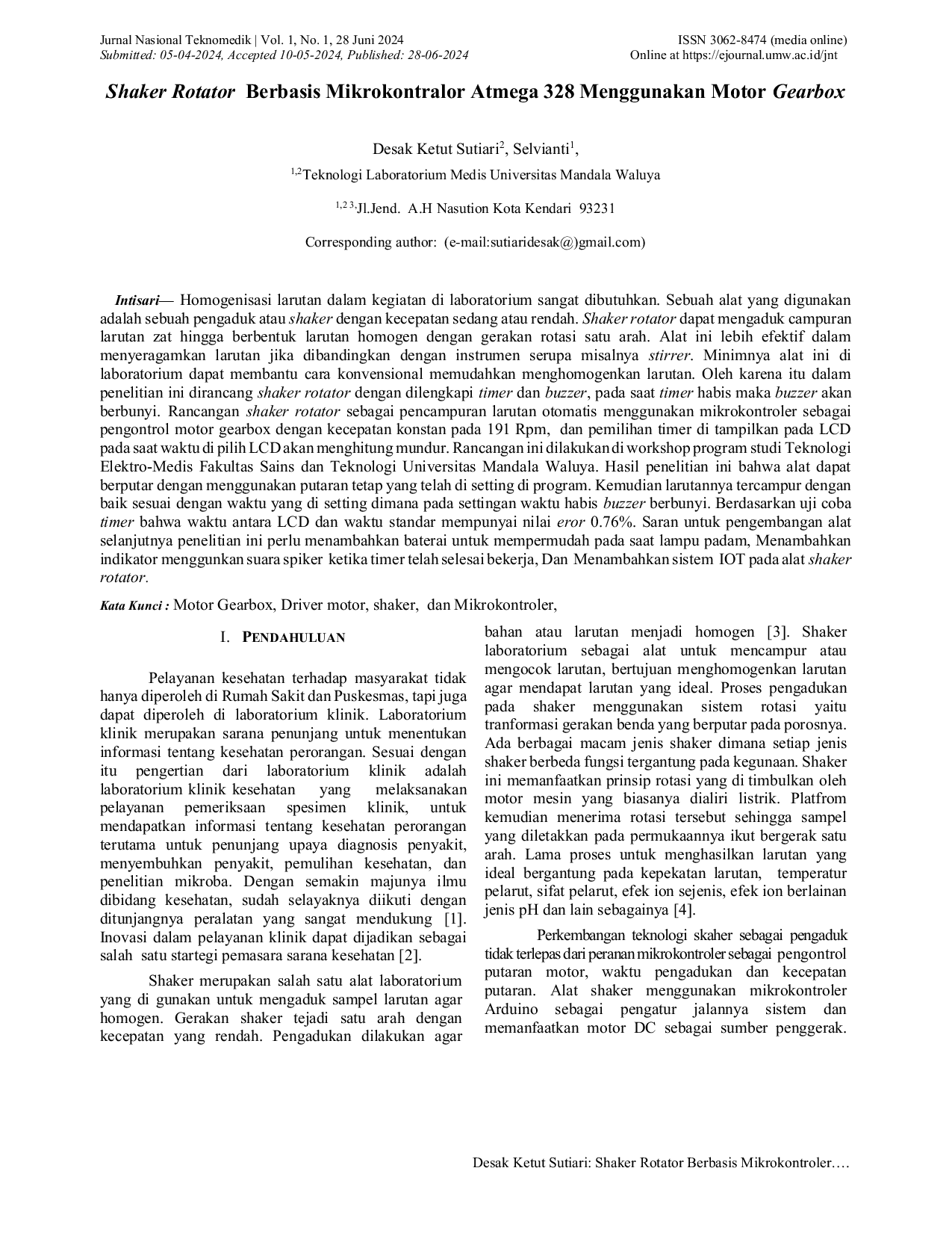 Jurnal Nasional TeknomedikJurnal Nasional TeknomedikHomogenisasi larutan dalam kegiatan di laboratorium sangat dibutuhkan. Sebuah alat yang digunakan adalah sebuah pengaduk atau shaker dengan kecepatan sedang atau rendah. Shaker rotator dapat mengaduk campuran larutan zat hingga berbentuk larutan homogen dengan gerakan rotasi satu arah. Alat ini lebih efektif dalam menyeragamkan larutan jika dibandingkan dengan instrumen serupa misalnya stirrer. Minimnya alat ini di laboratorium dapat membantu cara konvensional memudahkan menghomogenkan larutan. Oleh karena itu dalam penelitian ini dirancang shaker rotator dengan dilengkapi timer dan buzzer, pada saat timer habis maka buzzer akan berbunyi. Rancangan shaker rotator sebagai pencampuran larutan otomatis menggunakan mikrokontroler sebagai pengontrol motor gearbox dengan kecepatan konstan pada 191 Rpm, dan pemilihan timer di tampilkan pada LCD pada saat waktu di pilih LCD akan menghitung mundur. Rancangan ini dilakukan di workshop program studi Teknologi Elektro-Medis Fakultas Sains dan Teknologi Universitas Mandala Waluya. Hasil penelitian ini bahwa alat dapat berputar dengan menggunakan putaran tetap yang telah di setting di program. Kemudian larutannya tercampur dengan baik sesuai dengan waktu yang di setting dimana pada settingan waktu habis buzzer berbunyi. Berdasarkan uji coba timer bahwa waktu antara LCD dan waktu standar mempunyai nilai eror 0.76%. Saran untuk pengembangan alat selanjutnya penelitian ini perlu menambahkan baterai untuk mempermudah pada saat lampu padam, Menambahkan indikator menggunkan suara spiker ketika timer telah selesai bekerja, Dan Menambahkan sistem IOT pada alat shaker rotator.