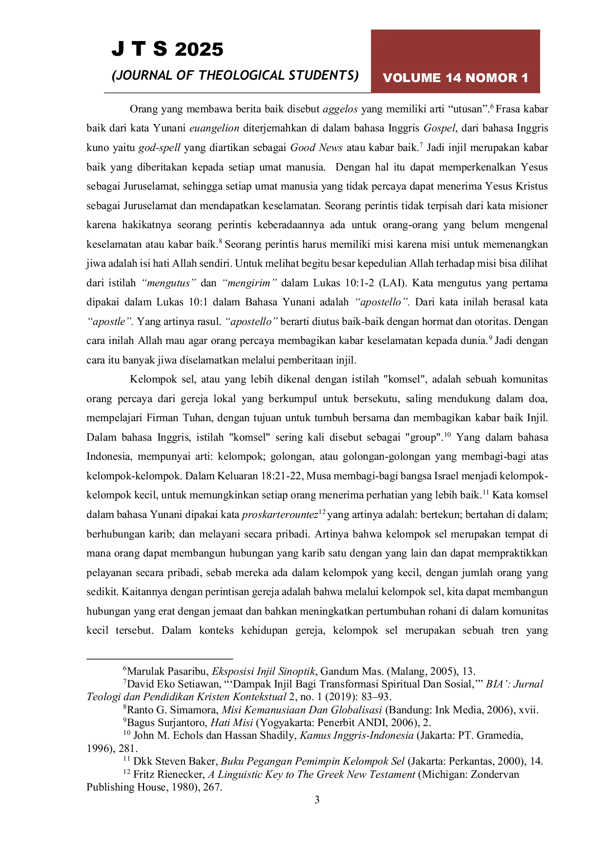 Jurnal of Theological Students, jurnal teologi, jurnal pendidikaJurnal of Theological Students, jurnal teologi, jurnal pendidikaPenelitian ini berangkat dari pemahaman bahwa pertumbuhan gereja yang sehat membutuhkan integrasi antara penginjilan, pemuridan, dan perintisan jemaat baru. Fokus penelitian diarahkan untuk mengidentifikasi faktor-faktor yang memengaruhi keberhasilan perintisan gereja, khususnya di GBT KAO Gajahmada Semarang, melalui kekuatan doa, kelompok sel, pemuridan, manajemen sumber daya manusia, serta pemberitaan Injil yang efektif dan Alkitabiah. Penelitian ini bertujuan menemukan elemen-elemen kunci yang mendorong keberhasilan pertumbuhan gereja lokal. Metode penelitian kualitatif digunakan untuk menggali informasi secara mendalam dan menghasilkan temuan yang tidak dapat dicapai melalui pendekatan statistik. Hasil penelitian menyimpulkan bahwa pertumbuhan gereja yang sehat dan berkelanjutan sangat dipengaruhi oleh keterpaduan antara doa, komunitas sel, pemberitaan Injil, dan pemuridan sebagai strategi terpadu dalam menjawab tantangan zaman pasca-pandemi.