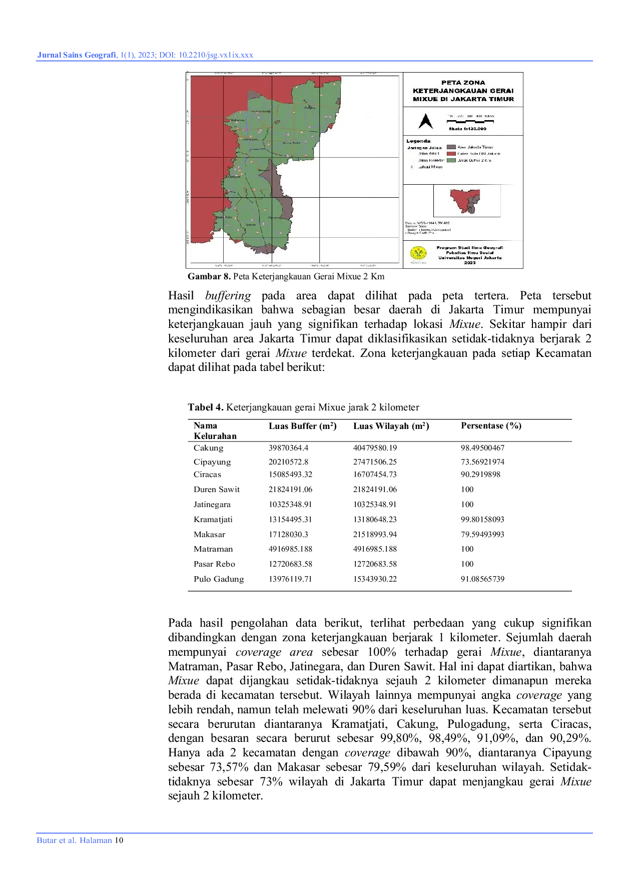 Jurnal Sains GeografiJurnal Sains GeografiMixue merupakan Franchise Dessert yang berkembang di Indonesia sejak 2020. Didirikan oleh Zhang Hongchao di Tiongkok pada tahun 2018 dan sekarang sudah masuk ke negara-negara Asia. Perkembangan dalam segi penjualan dan konsumen sangat besar dan berpotensi tinggi dalam dunia bisnis. Mixue di Indonesia sudah memiliki lebih dari 300 gerai, tidak hanya menyediakan es krim, Mixue menyediakan berbagai varian minuman yang membuat konsumen antusias membeli produk mulai dari kalangan anak-anak hingga dewasa. Penelitian ini bertujuan untuk mengetahui jarak keterjangkauan gerai Mixue terhadap pemukiman di Kota Jakarta Timur. Penelitian ini menggunakan metode NNA (Nearest Neighbor Analysis) dan buffering titik-titik lokasi. Nearest neighbor analysis (NNA) merupakan teknik analisis yang bertujuan untuk menentukan pola penyebaran suatu lokasi, dimana pola tersebut dapat berupa mengelompok (cluster), acak (random), hingga seragam (uniform). Persebaran lokasi Mixue dianalisis untuk mengetahui bagaimana pola sebaran titik lokasi terhadap seluruh area Jakarta Timu. Pengkajian kedekatan dan keterjangkauan lokasi menggunakan teknik buffering.