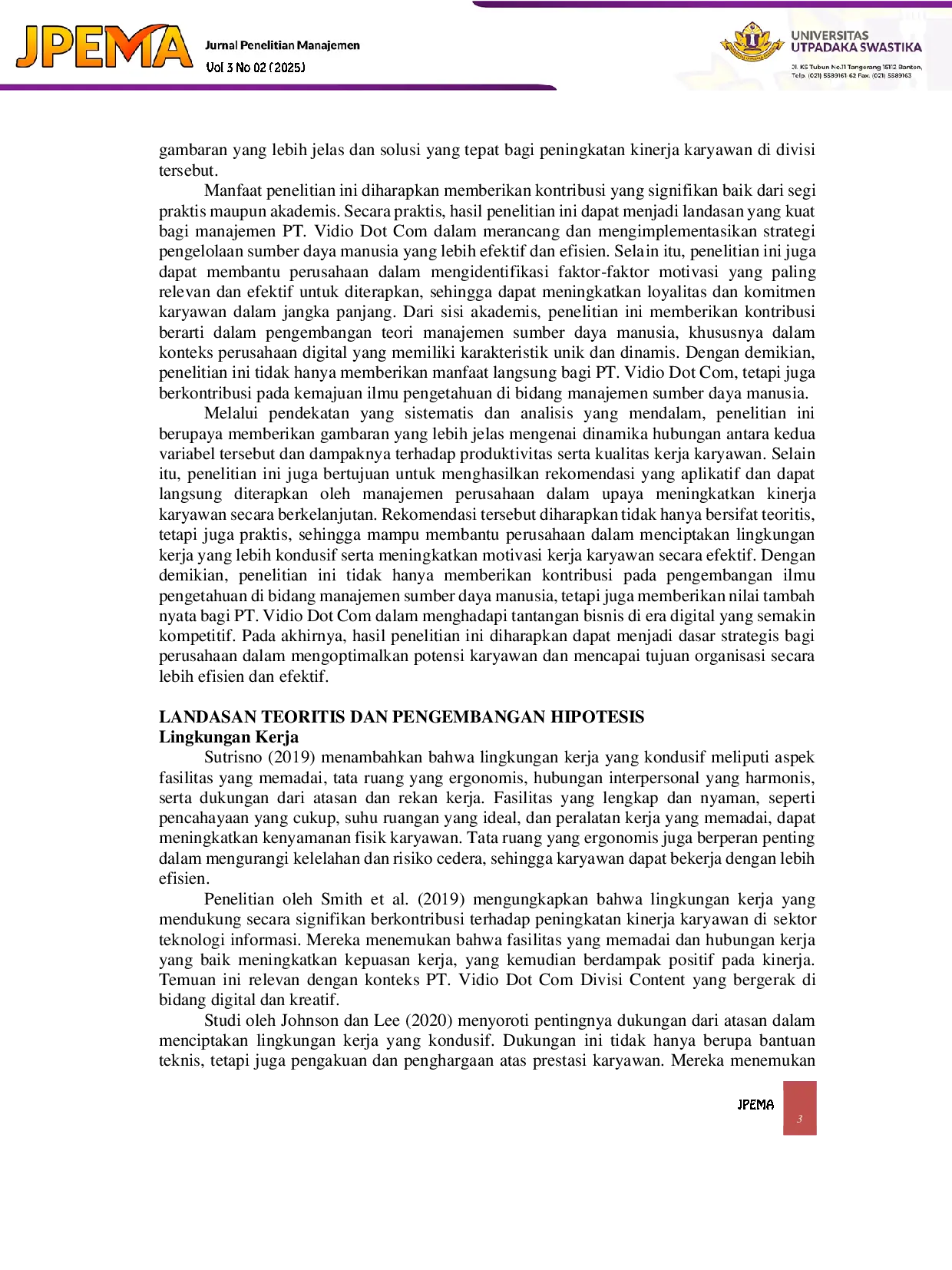 Jurnal Penelitian ManajemenJurnal Penelitian ManajemenPenelitian ini bertujuan untuk menganalisis pada PT. Vidio Dot Com Divisi Content. Permasalahan utama yang dibahas adalah sejauh mana faktor lingkungan kerja dan motivasi kerja dapat memengaruhi produktivitas dan efektivitas karyawan dalam menjalankan tugasnya. Desain penelitian menggunakan pendekatan kuantitatif dengan metode survei, dimana data dikumpulkan melalui kuesioner yang disebarkan kepada 100 karyawan divisi content. Analisis data dilakukan menggunakan regresi linier berganda untuk menguji hubungan antara variabel lingkungan kerja, motivasi kerja, dan kinerja karyawan. Hasil penelitian menunjukkan bahwa baik lingkungan kerja maupun motivasi kerja memiliki pengaruh positif dan signifikan terhadap kinerja karyawan. Lingkungan kerja yang kondusif dan motivasi yang tinggi meningkatkan produktivitas serta kualitas kerja karyawan secara signifikan. Interpretasi hasil ini mengindikasikan bahwa perusahaan perlu memperhatikan aspek fisik dan psikologis lingkungan kerja serta memberikan dorongan motivasi yang tepat untuk meningkatkan kinerja karyawan. Kesimpulannya, pengelolaan lingkungan kerja yang baik dan peningkatan motivasi kerja merupakan faktor kunci dalam meningkatkan kinerja karyawan di PT. Vidio Dot Com Divisi Content, sehingga perusahaan dapat mencapai tujuan bisnis secara optimal.
