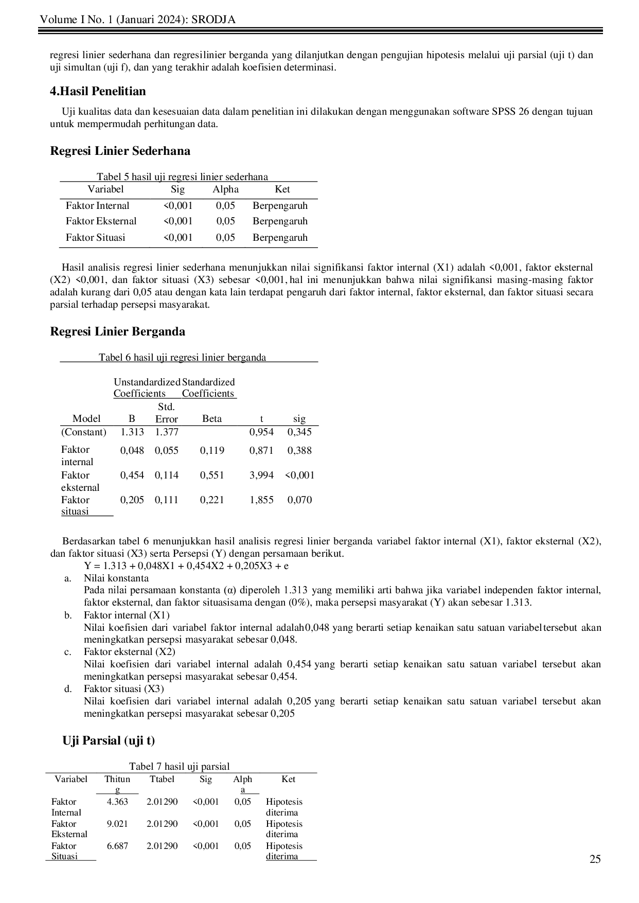SRODJA : Sroedji Journal AdministrationSRODJA : Sroedji Journal AdministrationArtikel ini menjelaskan dan menganalisis faktor-faktor yang mempengaruhi persepsi masyarakat mengenai aplikasi Haji Pintar di Kabupaten Bangkalan. Pelayanan berbasis e-government diharapkan mampu memberikan pelayanan yang mudah, murah, efektif, dan efisien kepada masyarakat. Namun, pada kenyataannya aplikasi Haji Pintar masih banyak mendapatkan komentar negatif karena dinilai tidak berfungsi sebagaimana mestinya. Penelitian ini didasarkan pada hasil penelitian yang menggunakan pendekatan kuantitatif asosiatif. Lokasi penelitian adalah Kantor Kementrian Agama Kabupaten Bangkalan. Populasi penelitian adalah masyarakat Bangkalan yang pernah menggunakan aplikasi Haji Pintar dari bulan April-Juni 2023 yang berjumlah 73 orang, dengan sampel sebanyak 50 responden yang dipilih menggunakan teknik probability sampling, yaitu simple random sampling. Metode analisis data yang digunakan adalah analisis regresi linier sederhana dan regresi linier berganda. Hasil penelitian menunjukkan bahwa faktor-faktor yang mempengaruhi persepsi yang terdiri dari faktor internal, faktor eksternal, dan faktor situasi berpengaruh secara parsial dan simultan terhadap persepsi masyarakat mengenai layanan aplikasi Haji Pintar di Kabupaten Bangkalan.