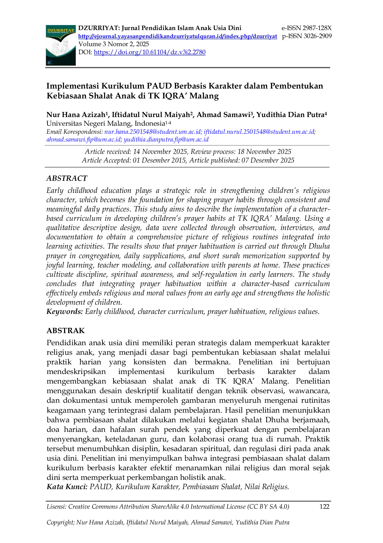 DZURRIYAT : Jurnal Pendidikan Islam Anak Usia DiniDZURRIYAT : Jurnal Pendidikan Islam Anak Usia DiniPendidikan anak usia dini memiliki peran strategis dalam memperkuat karakter religius anak, yang menjadi dasar bagi pembentukan kebiasaan shalat melalui praktik harian yang konsisten dan bermakna. Penelitian ini bertujuan mendeskripsikan implementasi kurikulum PAUD berbasis karakter dalam mengembangkan kebiasaan shalat anak di TK IQRA Malang. Penelitian menggunakan desain deskriptif kualitatif dengan teknik observasi, wawancara, dan dokumentasi untuk memperoleh gambaran menyeluruh mengenai rutinitas keagamaan yang terintegrasi dalam pembelajaran. Hasil penelitian menunjukkan bahwa pembiasaan shalat dilakukan melalui kegiatan shalat Dhuha berjamaah, doa harian, dan hafalan surah pendek yang diperkuat dengan pembelajaran menyenangkan, keteladanan guru, dan kolaborasi orang tua di rumah. Praktik tersebut menumbuhkan disiplin, kesadaran spiritual, dan regulasi diri pada anak usia dini. Penelitian ini menyimpulkan bahwa integrasi pembiasaan shalat dalam kurikulum berbasis karakter efektif menanamkan nilai religius dan moral sejak dini serta memperkuat perkembangan holistik anak.