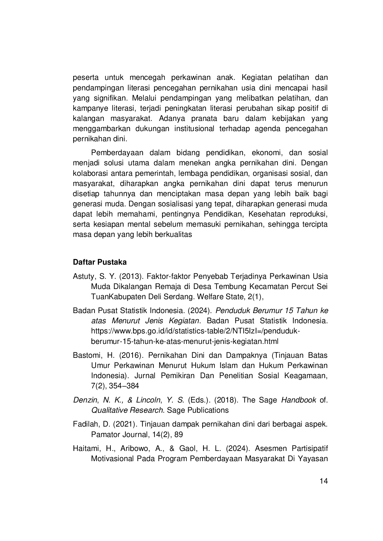 Aksi Sosial : Jurnal Pengabdian Kepada MasyarakatAksi Sosial : Jurnal Pengabdian Kepada MasyarakatFenomena perkawinan di bawah umur masih banyak kita jumpai di berbagai daerah. Usia perkawinan muda berbanding lurus dengan tinggi angka perceraian dikarenakan pasangan muda dianggap belum matang dalam membina rumah tangga. Perkawinan di bawah umur terjadi karena beberapa alasan diantaranya masalah ekonomi, atas kehendak anak itu sendiri, pemahaman budaya dan nilai-nilai tertentu dari masyarakat itu sendiri dan pergaulan bebas. Tujuan kegiatan pengabdian ini adalah untuk meningkatkan di Dusun Tandan Golok Desa Bebidas, kecamatan Wanasaba. Metode pengabdian kepada masyarakat yang digunakan adalah participatory action research (PAR), yang melibatkan partisipasi aktif masyarakat dan generasi milenial berjumlah 20 orang. Teknik pengambilan sampel menggunakan sampling purposive. Hasil pengabdian kepada masyarakat bahwa participatory action research (PAR) terbukti efektif dalam meningkatkan literasi pencegahan pernikahan usia dini, sehingga dapat meningkatkan pengetahuan mereka.