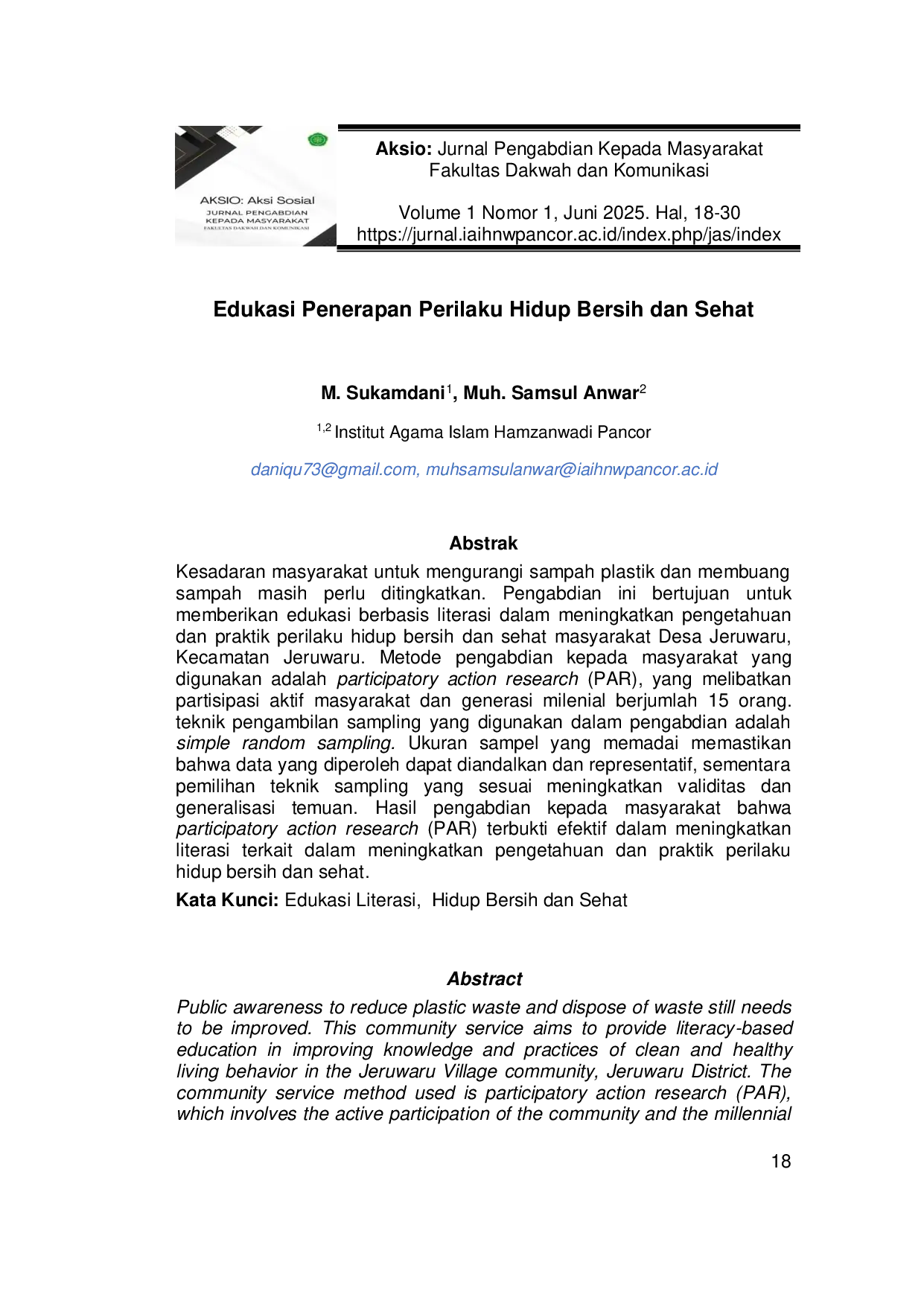 Aksi Sosial : Jurnal Pengabdian Kepada MasyarakatAksi Sosial : Jurnal Pengabdian Kepada MasyarakatKesadaran masyarakat untuk mengurangi sampah plastik dan membuang sampah masih perlu ditingkatkan. Pengabdian ini bertujuan untuk memberikan edukasi berbasis literasi dalam meningkatkan pengetahuan dan praktik perilaku hidup bersih dan sehat masyarakat Desa Jeruwaru, Kecamatan Jeruwaru. Metode pengabdian kepada masyarakat yang digunakan adalah participatory action research (PAR), yang melibatkan partisipasi aktif masyarakat dan generasi milenial berjumlah 15 orang. Teknik pengambilan sampling yang digunakan dalam pengabdian adalah simple random sampling. Ukuran sampel yang memadai memastikan bahwa data yang diperoleh dapat diandalkan dan representatif, sementara pemilihan teknik sampling yang sesuai meningkatkan validitas dan generalisasi temuan. Hasil pengabdian kepada masyarakat bahwa participatory action research (PAR) terbukti efektif dalam meningkatkan literasi terkait dalam meningkatkan pengetahuan dan praktik perilaku hidup bersih dan sehat.